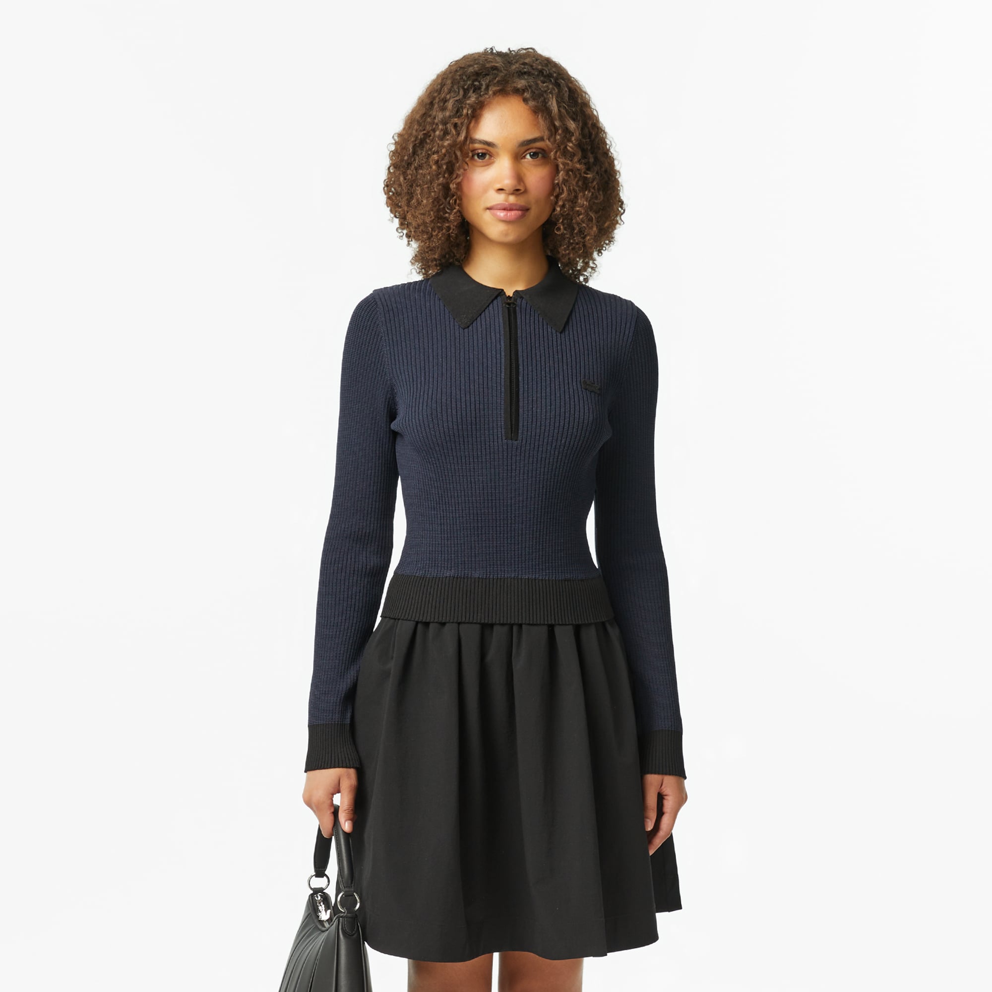 Lacoste Kadın Classic Fit Uzun Kollu Yarım Fermuarlı Çizgili Siyah Elbise