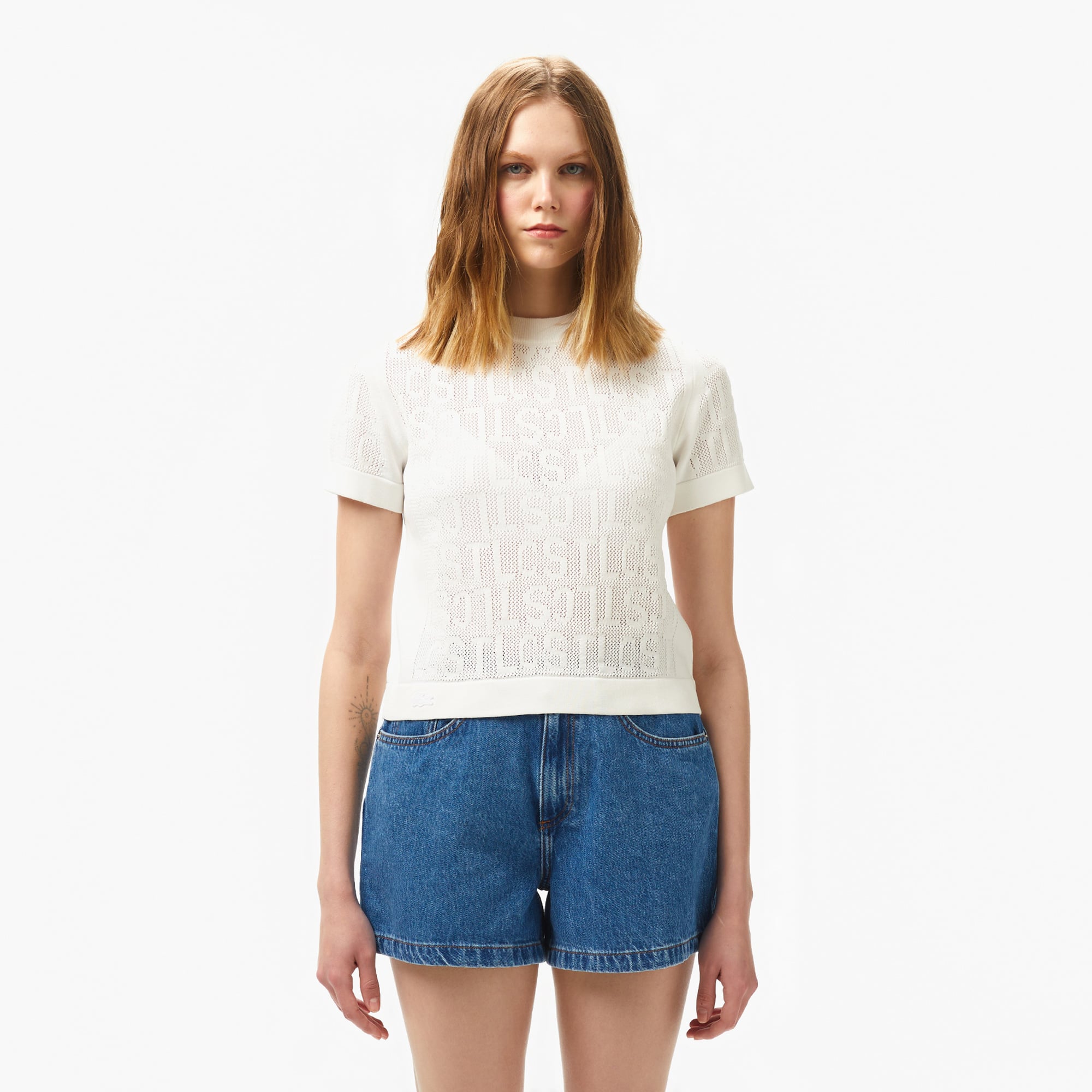 Lacoste Kadın Kısa Kollu Bisiklet Yaka Desenli Beyaz Triko