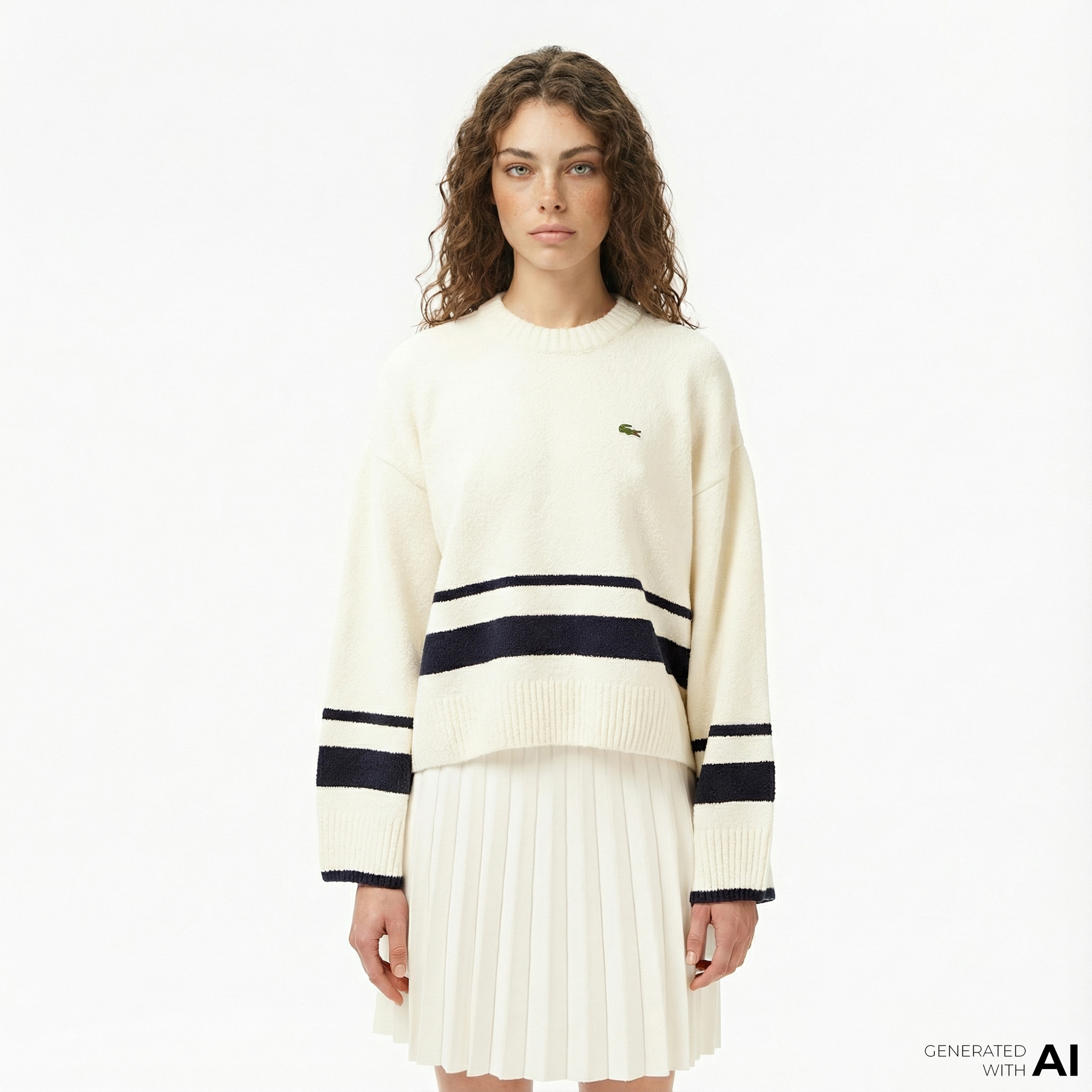Lacoste Kadın Loose Fit Bisiklet Yaka Çizgili Krem Kazak