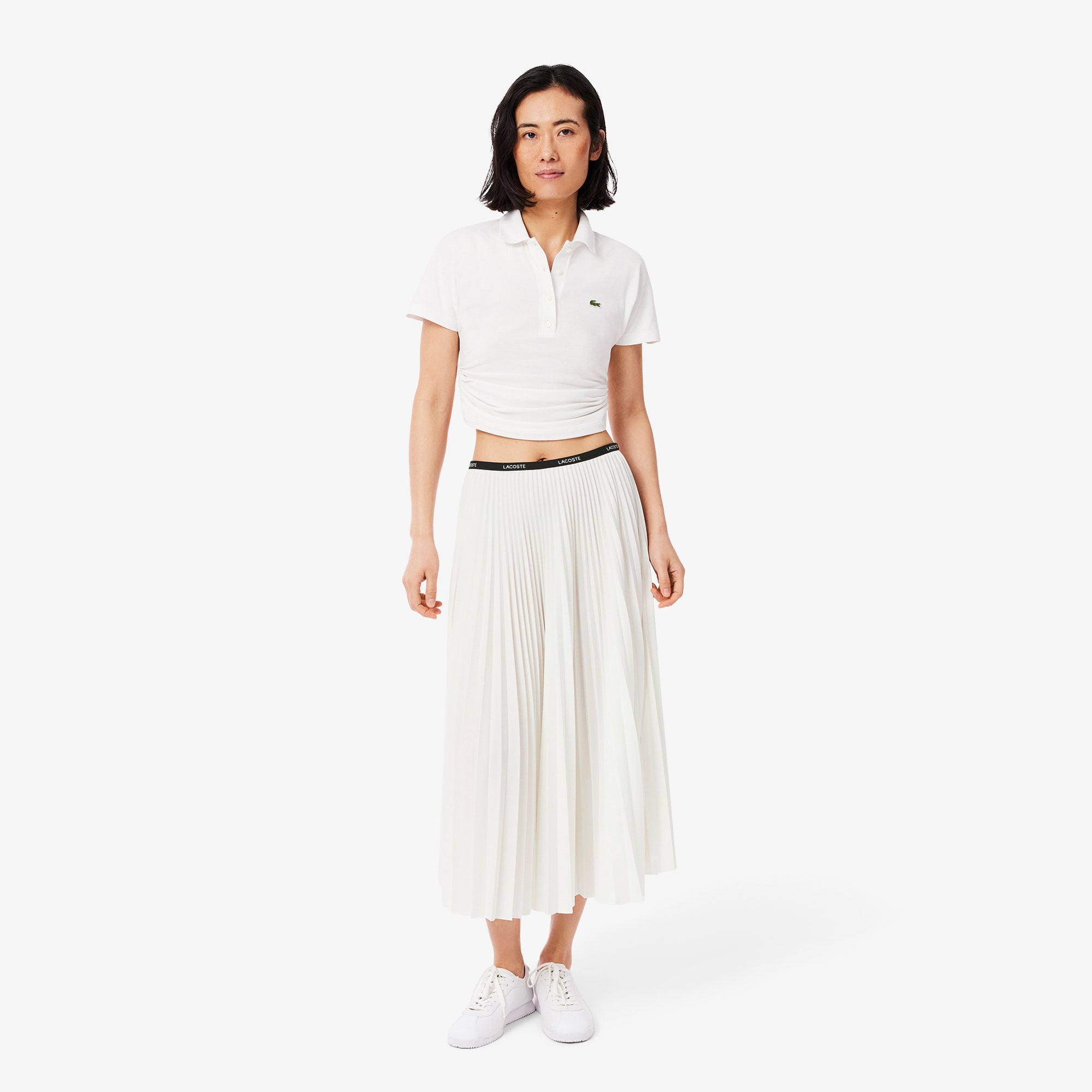 Lacoste gardırobunun vazgeçilmez parçalarından biri olan pileli etek, geri dönüştürülmüş kumaşıyla çevre dostu ve şık bir alternatif sunuyor. Midi boy kesimi, zarif bir görünüm yaratıyor. Lacoste baskılı elastik bel bandı modern bir dokunuş katıyor. Sade tasarımı sayesinde her stile kolayca uyum sağlıyor ve şıklığı konforla birleştiriyor.