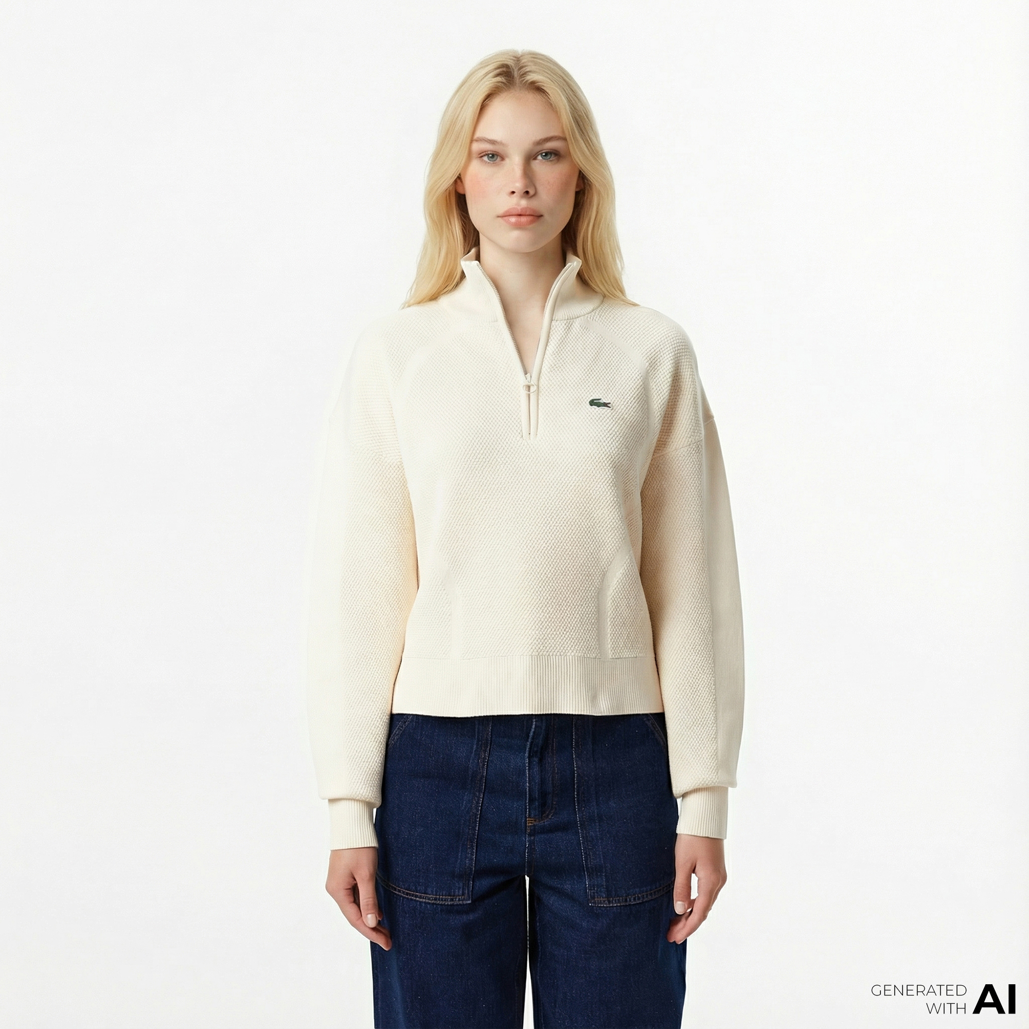 Lacoste Kadın Relaxed Fit Yarım Fermuarlı Krem Kazak