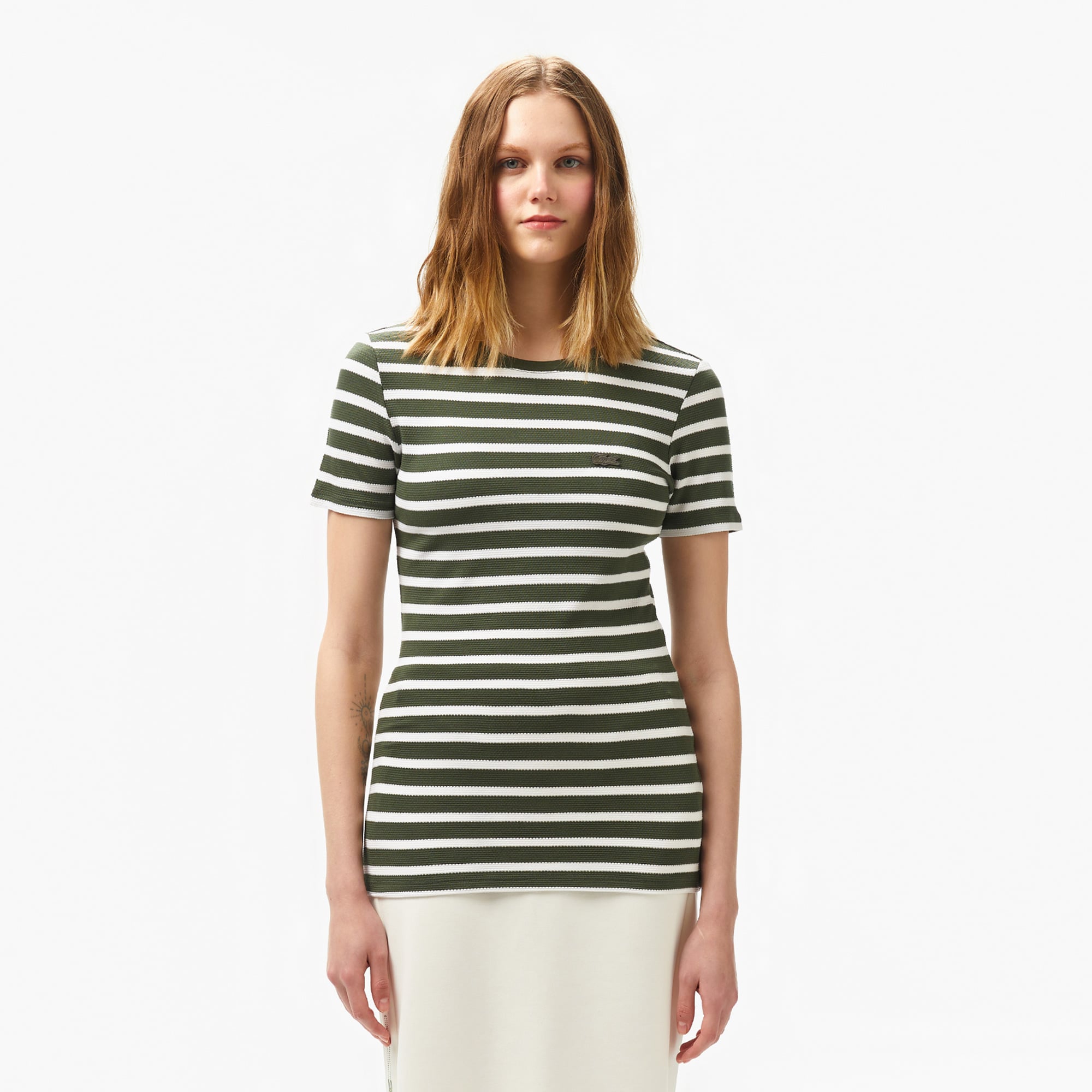 Lacoste Kadın Slim Fit Bisiklet Yaka Çizgili Koyu Yeşil T-Shirt