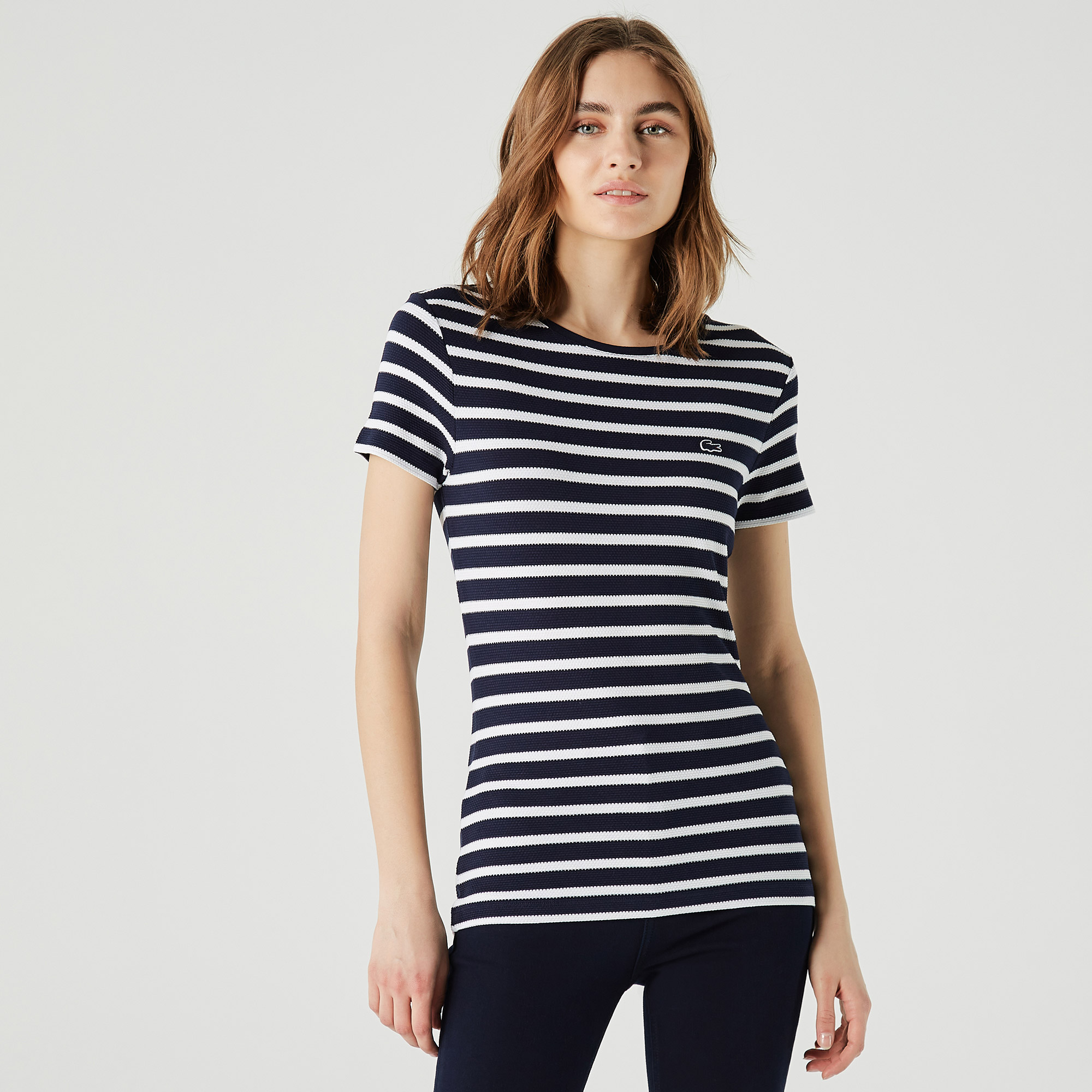 Lacoste Kadın Slim Fit Bisiklet Yaka Çizgili Lacivert T-Shirt