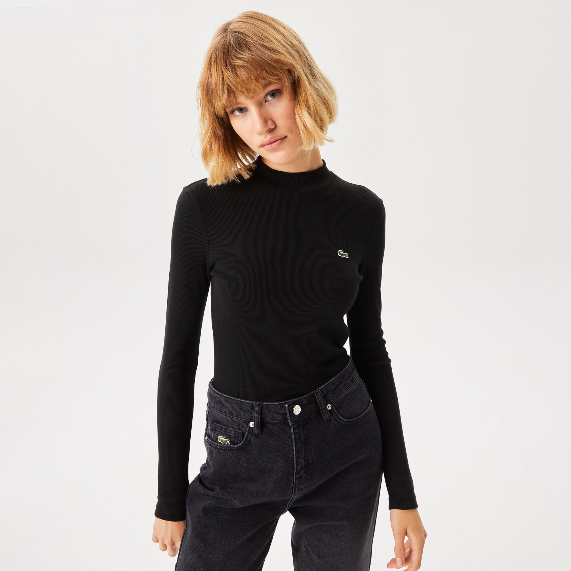 Lacoste Kadın Slim Fit Uzun Kollu Bisiklet Yaka Siyah T-Shirt