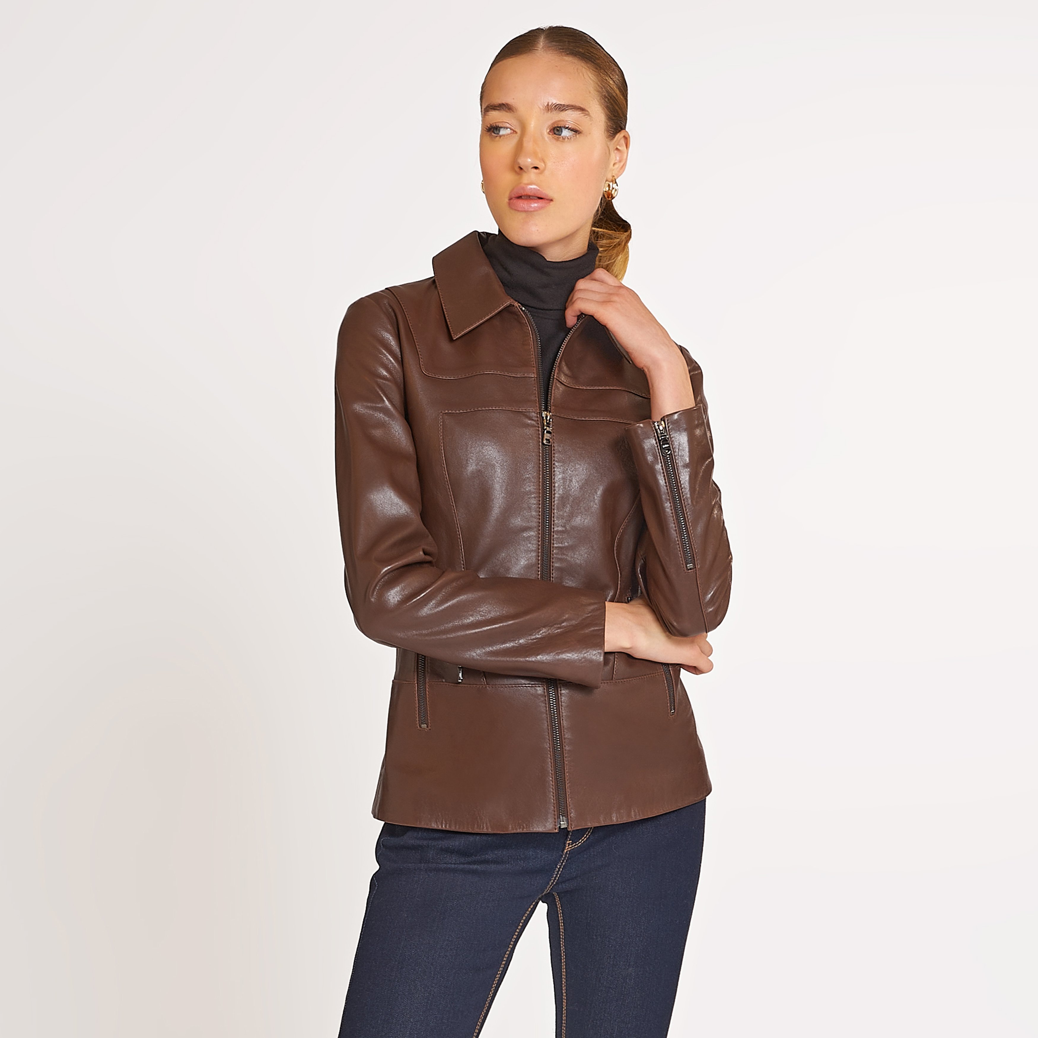 %100 koyun derisinden ve astarlı çalışılmıştır. Kombinlerin tamamlayıcı parçası olacak, çift taraflı deri mont. Gömlek yakalı ve önden metal fermuar kapalıdır. Altta iki adet yandan girişli metal fermuar detaylı cebi mevcuttur. Ürün üzerine özel olarak dekoratif kesimler ile hareketlilik kazandırılmıştır.