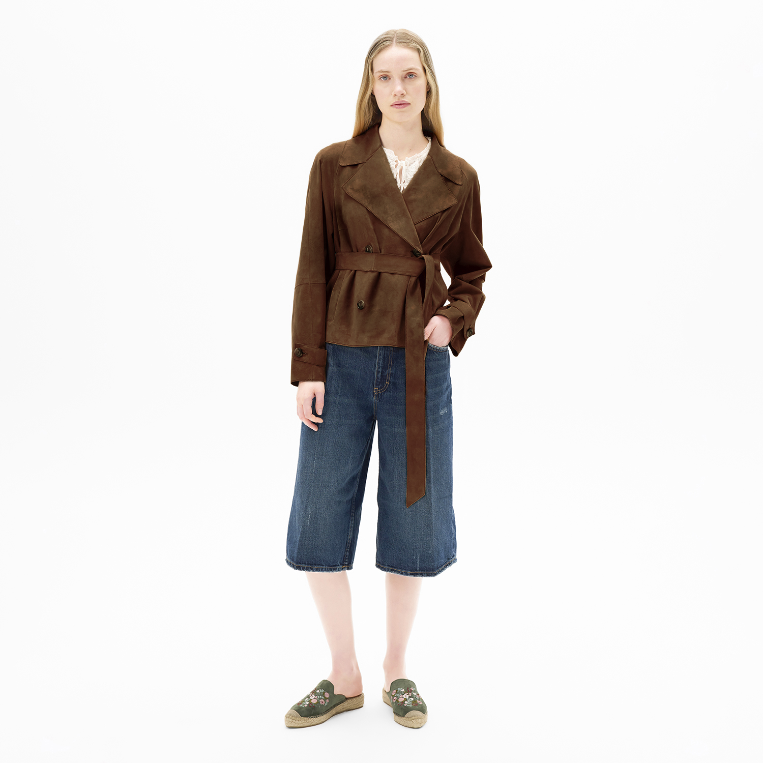 Kadın yakalı kısa süet trençkot, önden kruvaze düğme kapamalıdır. Önde altta iki adet yandan girişli cebi mevcuttur. Belde kendi derisinden bağlamalı kemeri mevcuttur. Günlük kullanım için çok uygun ve rahat bir kalıptır. %100 deri olup astarsız çalışılmıştır. Bu ürün, et endüstrisinin yan ürünü olarak elde edilen ve sürdürülebilir yöntemler ile Leather Working Group Altın sertifikalı Desa tesislerinde tabaklanan deriler kullanılarak üretilmiştir. % Keçi derisinden üretilmiştir.-Kadın yakalı kısa süet trençkot, önden kruvaze düğme kapamalıdır. Önde altta iki adet yandan girişli cebi mevcuttur. Belde kendi derisinden bağlamalı kemeri mevcuttur. Günlük kullanım için çok uygun ve rahat bir kalıptır. %100 deri olup astarsız çalışılmıştır. Bu ürün, et endüstrisinin yan ürünü olarak elde edilen ve sürdürülebilir yöntemler ile Leather Working Group Altın sertifikalı Desa tesislerinde tabaklanan deriler kullanılarak üretilmiştir. % Keçi derisinden üretilmiştir.