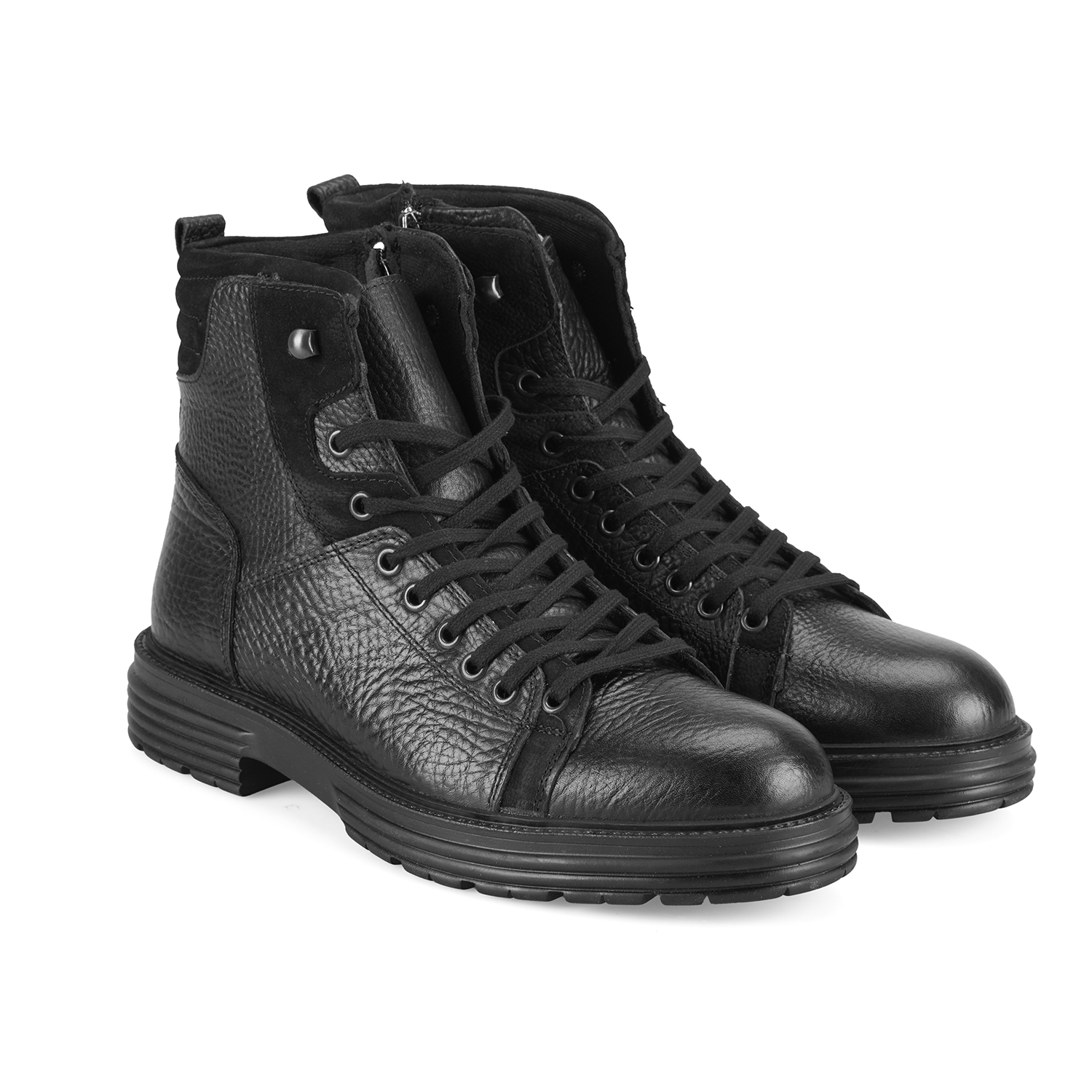 %100 deri, deri iç tabanlı, tekstil astarlı, kauçuk tabanlı, içten fermuarlı erkek bağcıklı postal.