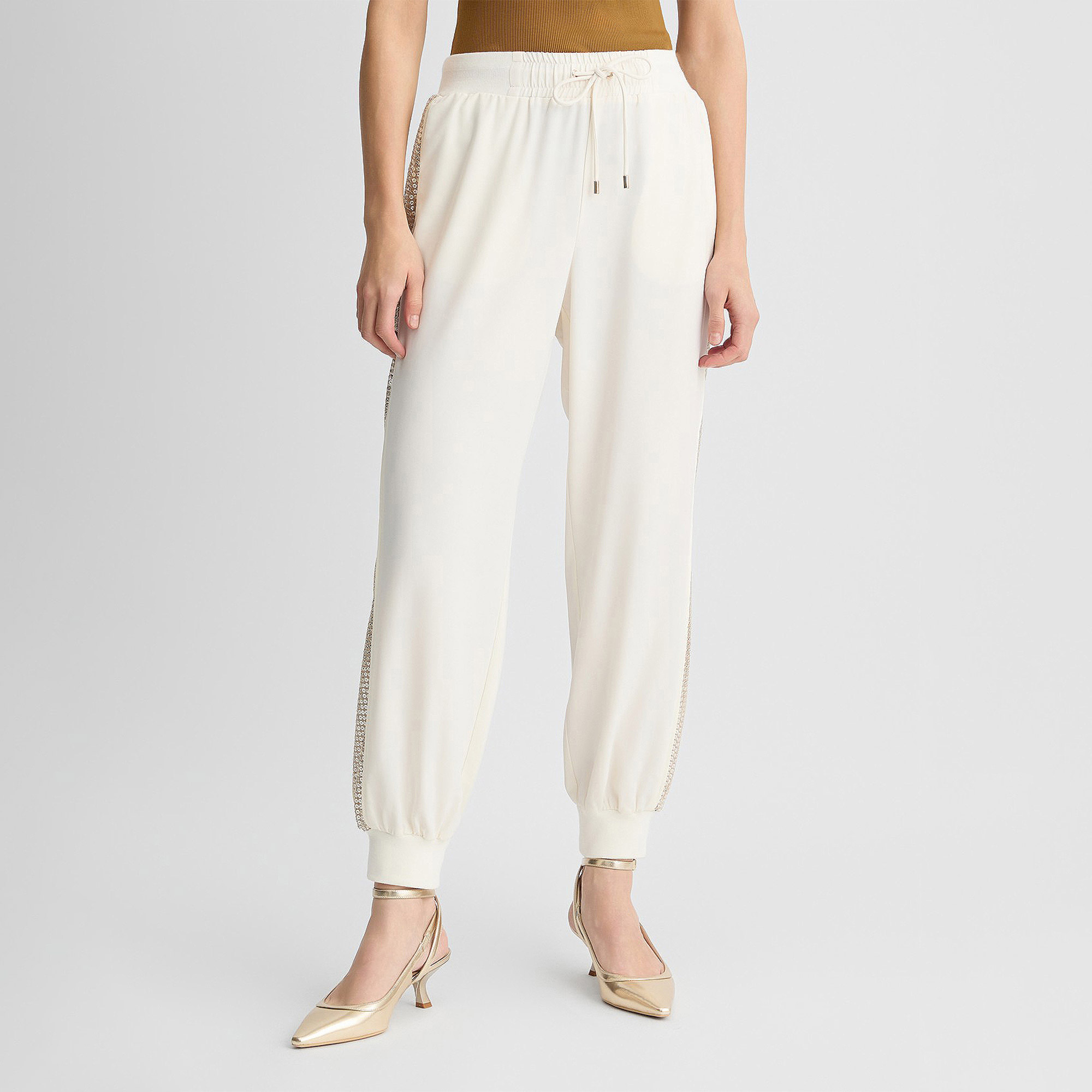 Liu Jo'nun beyaz pantolonu, zarif tasarımı ve kaliteli kumaşıyla şıklığınızı ön plana çıkarıyor. Yüksek bel kesimi ve flare paça modeliyle modern bir görünüm sunarken, esnek yapısı gün boyu rahatlık sağlar. Altın tonlarındaki metal detaylar, pantolonu tamamlayarak ona şıklık katıyor. Hem günlük kullanımda hem de şık kombinlerde rahatlıkla tercih edilebilecek mükemmel bir parça.