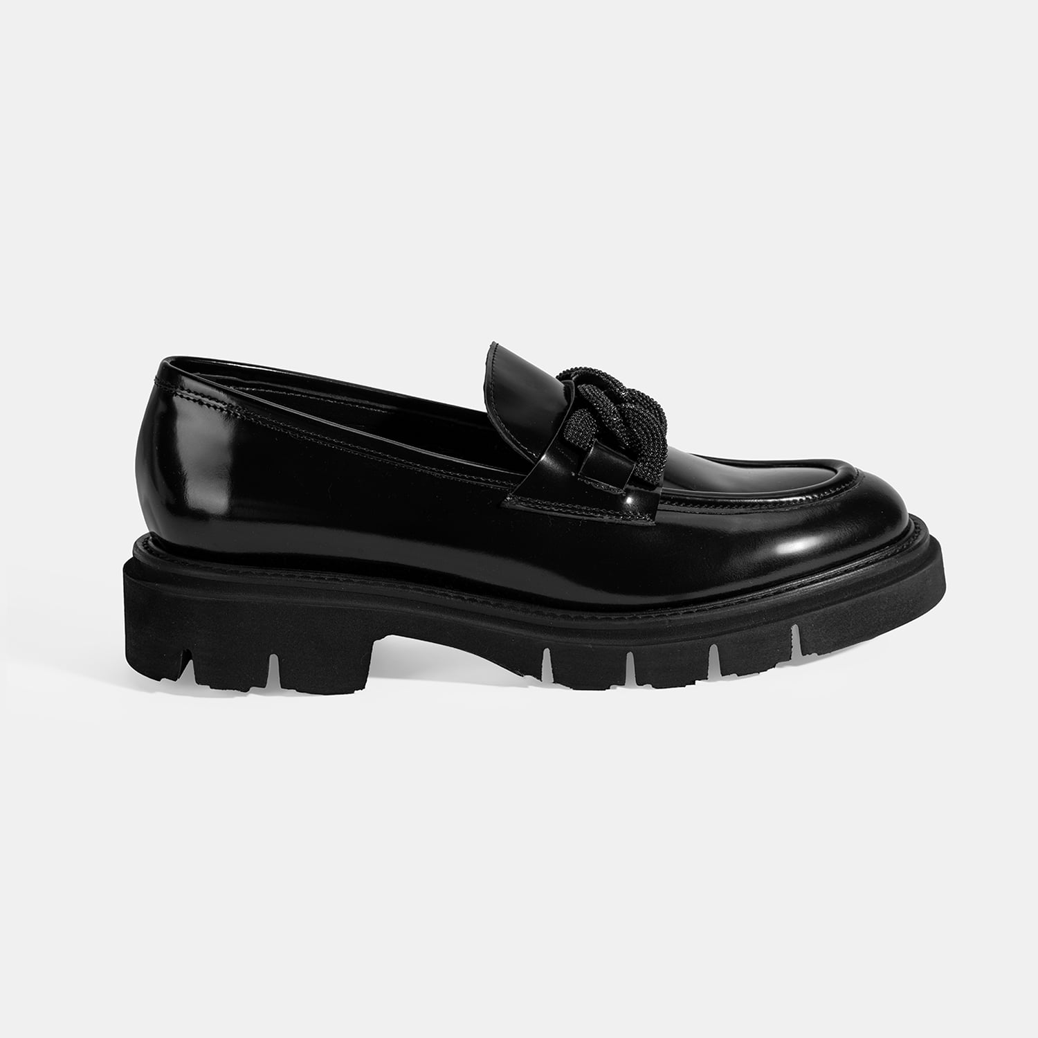 %100 deri, deri iç tabanlı, deri astarlı, metal zincir aksesuar detaylı, eva tabanlı, kadın loafer. Topuk yüksekliği 4 cm