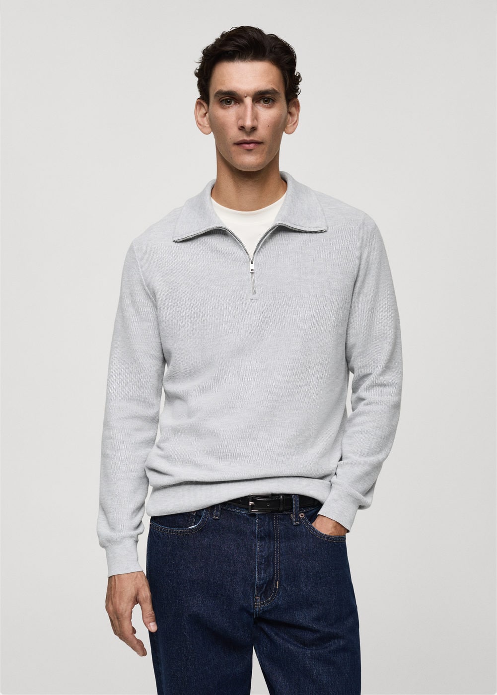 Mango Erkek Fermuarlı Balıkçı Yaka Kalıplı Kazak Orta Kırçıllı Gri