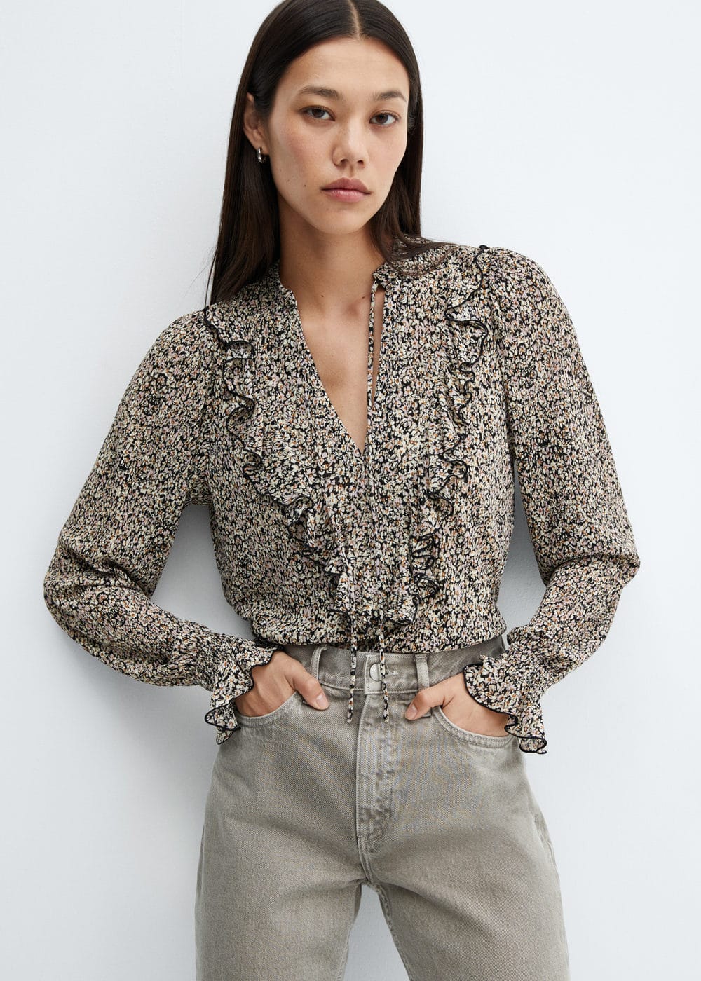 Bluz .-- linus. Yan dikiş uzunluğu 31.3 cm Arka uzunluk 58.9 cm. Dökümlü kumaş, Düz tasarım, Çiçekli, V yakalı, Uzun kollu ve manşetli, Boyundan bağlamalı, Yakası fırfır detaylı, Büyük Beden Mevcuttur. 100% polyester. KISA SANTRFÜJLE MAKİNEDE MAKS. 30°C'DE YIKAYIN. ÇAMAŞIR SUYU KULLANMAYIN. ÜTÜLEMEYİN. KURU TEMİZLEME YAPILMAZ. KURUTMA MAKİNESİNDE KURUTULAMAZ