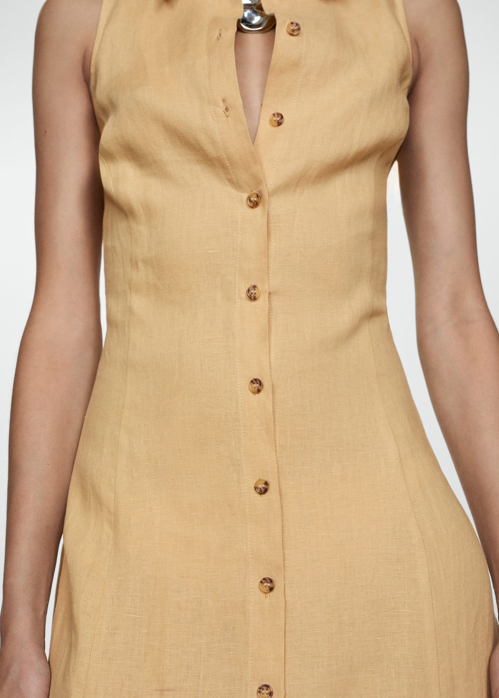 Elbise .-- alice. Yan dikiş uzunluğu 104.5 cm Arka uzunluk 128.0 cm. %100 keten kumaş, Uzun tasarım, A-kesim tasarım, Gömlek yaka, Kolsuz, Ön düğme kapama. 100% keten. Makinede maks. 30°C'de yikayin. Çamaşir suyu kullanmayin. Maks. 110°C ile ütüleyin. Kuru temizleme yapilmaz. Kurutma makinesinde kurutulamaz