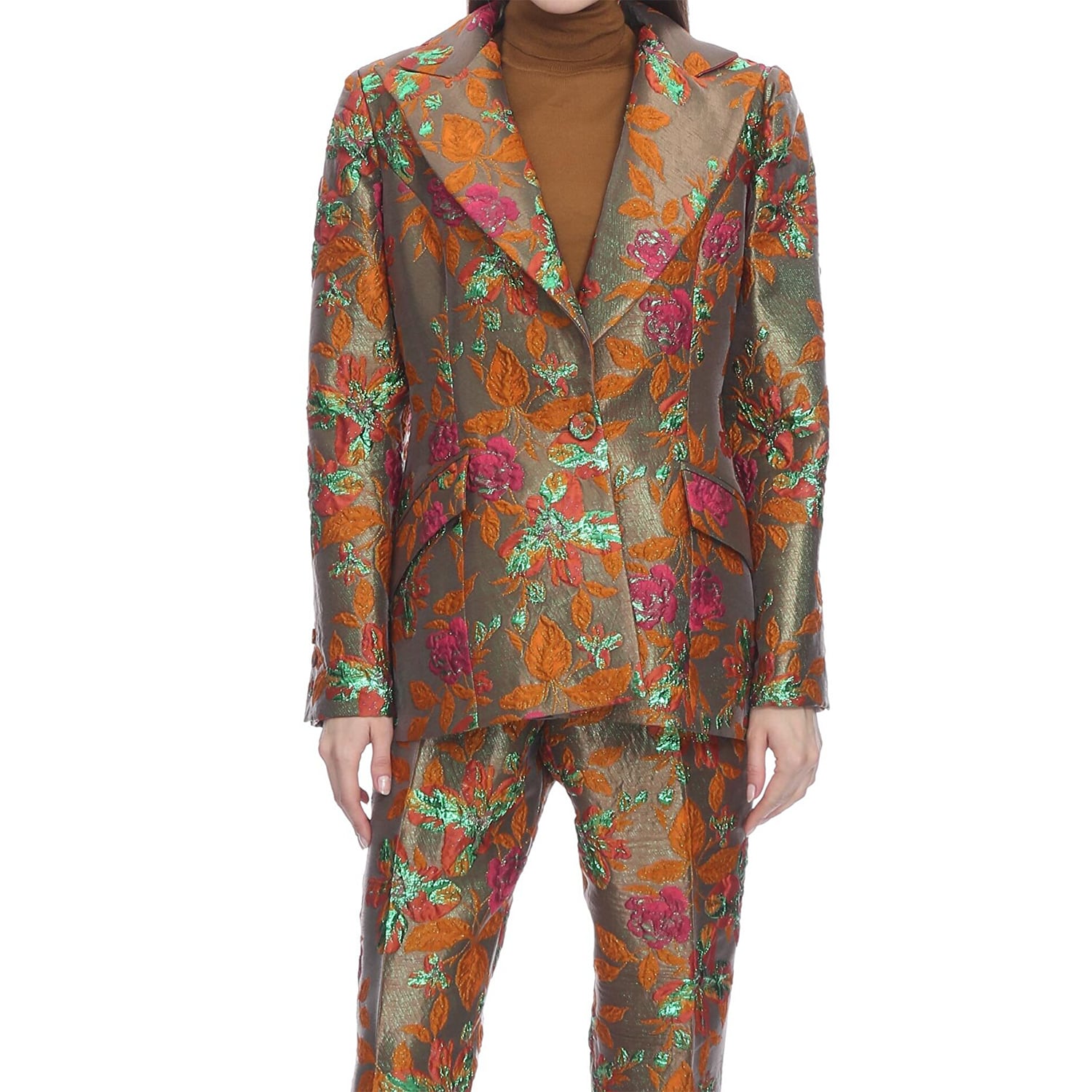 Blazer ceket, kumaşın desenlerini öne çıkaran zarif bir kesime sahip olabilir. Ön tarafta düğmelerle kapanan ceket, klasik blazer tasarımının yanı sıra barok etkilerle özelleştirilmiş olabilir. Kol manşetleri ve cep detayları, takımın genel estetiğini tamamlar.