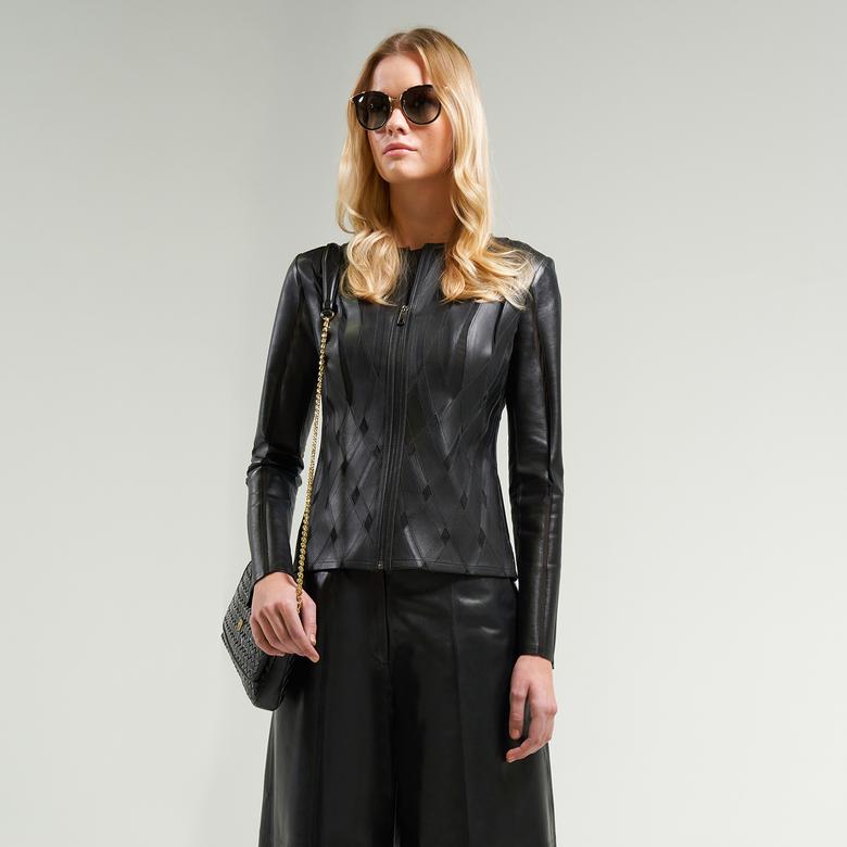 Kadın anatomik deri ceket. Yuvarlak yakalı ve önden metal fermuar kapamalıdır. Cebi yoktur. Özel deri panel ve tül laminasyon çalışması yapılmıştır. Şık aksesuarları mevcuttur. Astarsız olduğu için yaz mevsiminde rahatlıkla giyilebilir. Özel dekoratif panelleme tekniği ile üretilmiştir. Kadın vücut anatomisini vurgulamak için; esneyen tül ile desteğiyle bedene yerleştirilen deriler sayesinde hem rahat hem de fit bir görünüm kazandırılmıştır.. %100 koyun derisinden olup astarsız çalışılmıştır. Bu ürün, et endüstrisinin yan ürünü olarak elde edilen ve sürdürülebilir yöntemler ile Leather Working Group Altın sertifikalı Desa tesislerinde tabaklanan deriler kullanılarak üretilmiştir.-Kadın anatomik deri ceket. Yuvarlak yakalı ve önden metal fermuar kapamalıdır. Cebi yoktur. Özel deri panel ve tül laminasyon çalışması yapılmıştır. Şık aksesuarları mevcuttur. Astarsız olduğu için yaz mevsiminde rahatlıkla giyilebilir. Özel dekoratif panelleme tekniği ile üretilmiştir. Kadın vücut anatomisini vurgulamak için; esneyen tül ile desteğiyle bedene yerleştirilen deriler sayesinde hem rahat hem de fit bir görünüm kazandırılmıştır.. %100 koyun derisinden olup astarsız çalışılmıştır. Bu ürün, et endüstrisinin yan ürünü olarak elde edilen ve sürdürülebilir yöntemler ile Leather Working Group Altın sertifikalı Desa tesislerinde tabaklanan deriler kullanılarak üretilmiştir.