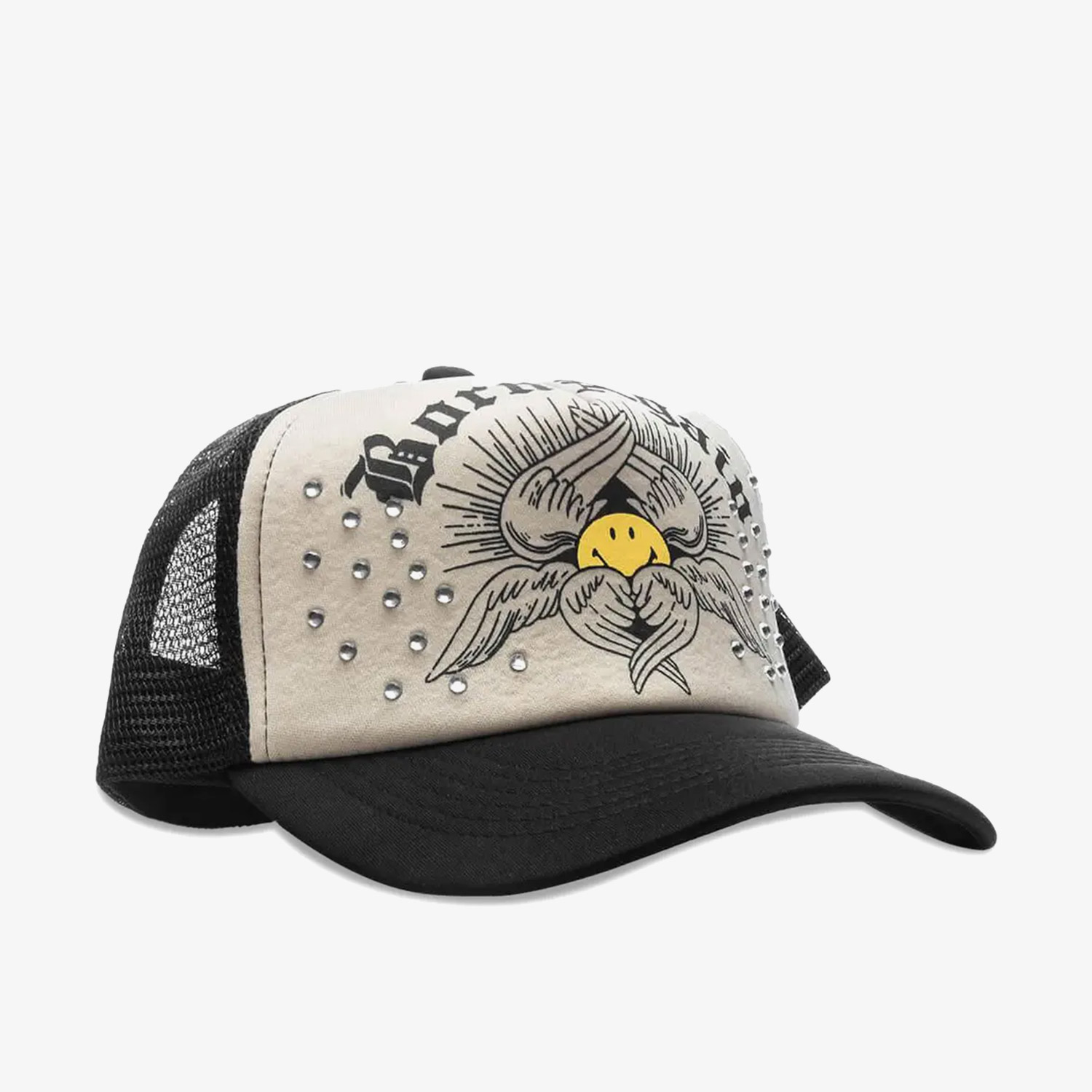 Market Smiley şapka, krem ve siyah renk kombinasyonu ile dikkat çeker. Eğlenceli tasarımı ve rahat yapısıyla şıklık ve konfor sunar.