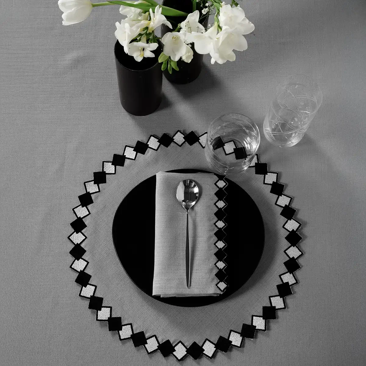 Matilda 2'li Peçete, gri renginin modern ve zarif duruşuyla sofralarınıza şıklık katıyor. Dayanıklı ve kaliteli kumaşı sayesinde hem günlük kullanıma hem de özel davetlere uyum sağlayarak uzun ömürlü bir kullanım sunuyor.