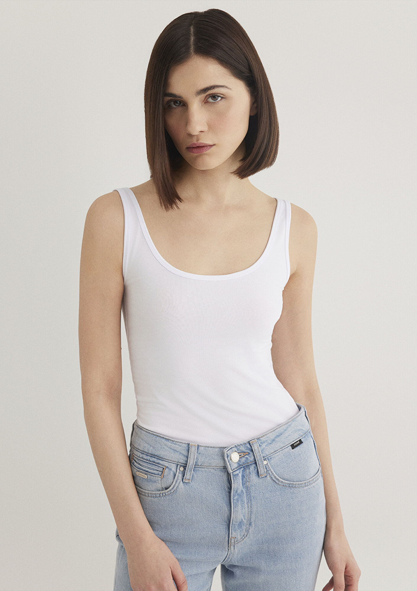 Beyaz Basic Stretch Atlet, pamuk karışımlı esnek kumaştan üretilmiş orta ağırlıkta bir üründür. Fitted, vücuda oturan kesimi ve kolsuz tasarımı ile şık bir görünüm sunar. Kayık yaka özelliği ile rahat bir kullanım sağlayan bu atlet, düz dokusu ve beyaz rengiyle her tarza uyum sağlar.