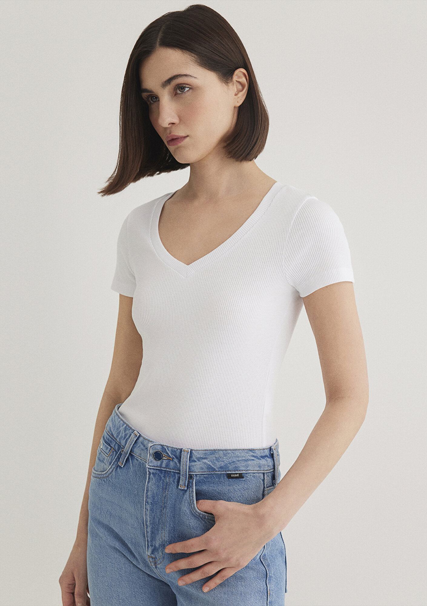 Beyaz Basic V Yaka Tişört, yüzde yüz pamuklu orta ağırlıkta kumaştan üretilmiştir. Fitted, vücuda oturan kesimi ve V yakası ile şık bir görünüm sunar. Kısa kollu tasarımı ve düz dokusu ile klasik bir stil oluşturur. Bu tişört, günlük kullanım için ideal bir temel parçadır.