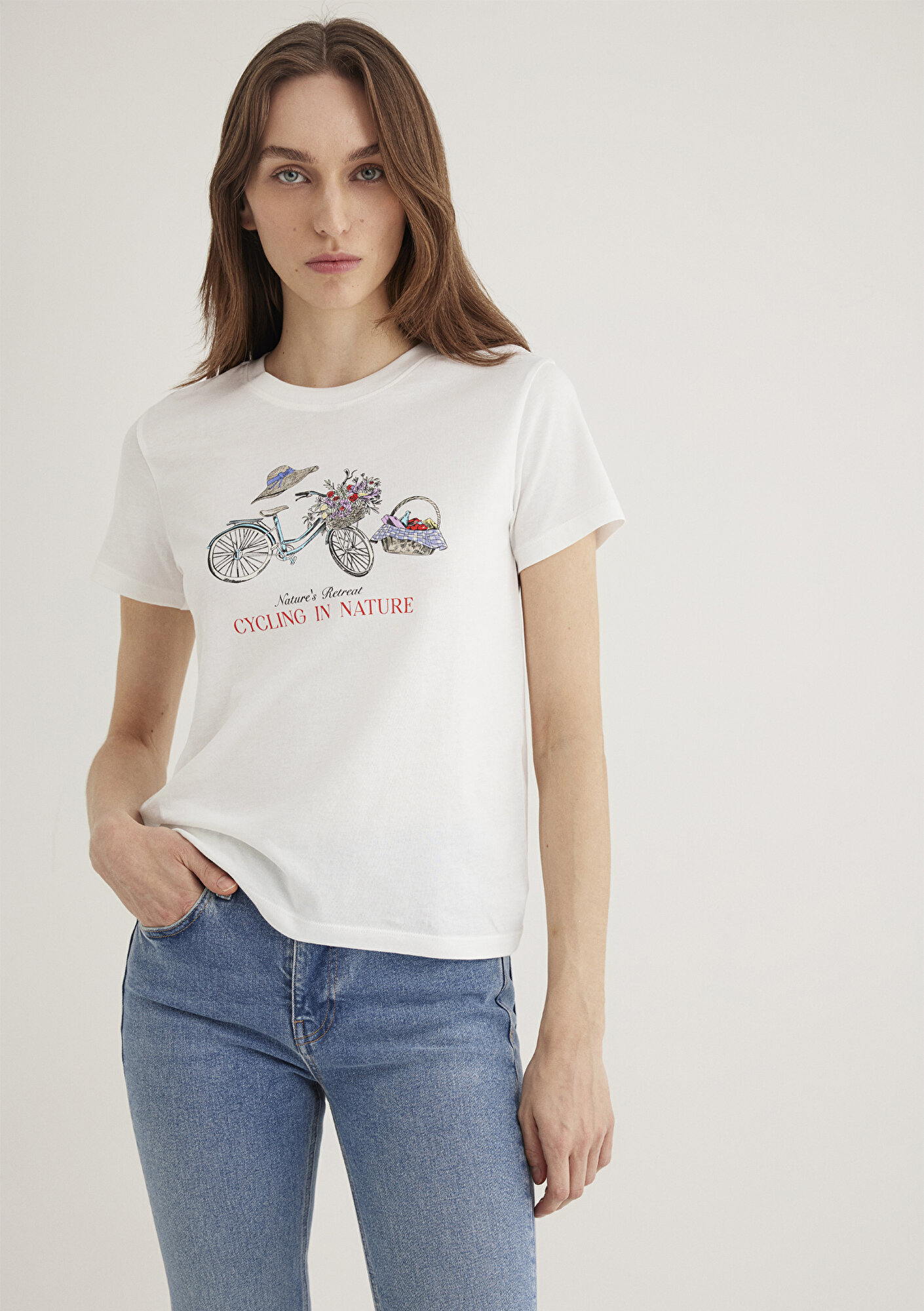Bisiklet Baskılı Ekru Tişört, yüzde yüz pamuklu hafif ağırlıklı kumaştan üretilmiştir. Yarı dar kesimli ve bisiklet yakalı olan bu tişört, ön kısmında renkli bisiklet, çiçek sepeti ve hasır şapka baskısı ile dikkat çeker. Kısa kollu tasarımı ve Natures Retreat Cycling in Nature yazısıyla doğa temalı bir görünüm sunar.