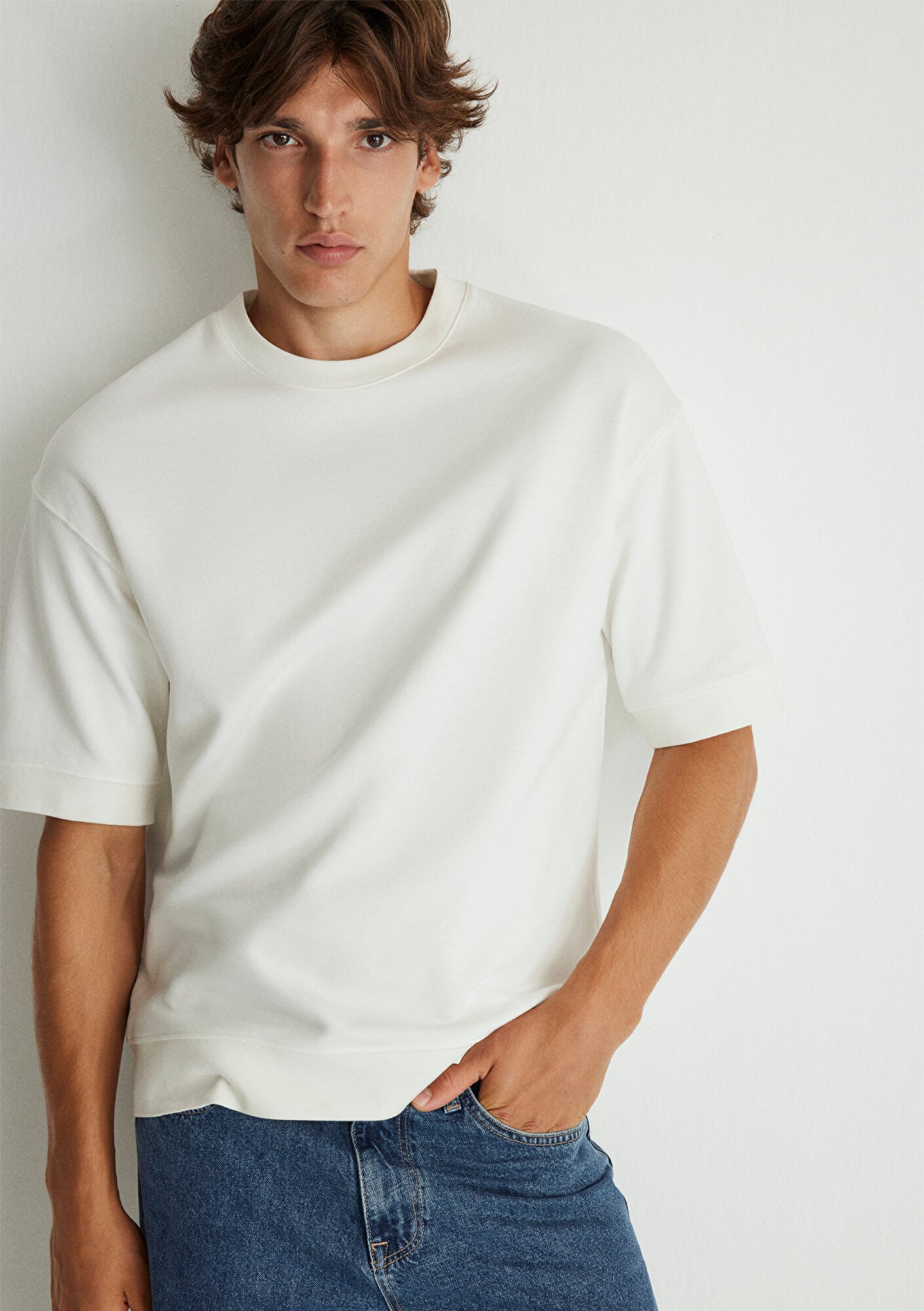 Loose fit, rahat kesim. Bisiklet yaka. Kısa kol. Bisiklet Yaka Beyaz Tişört.