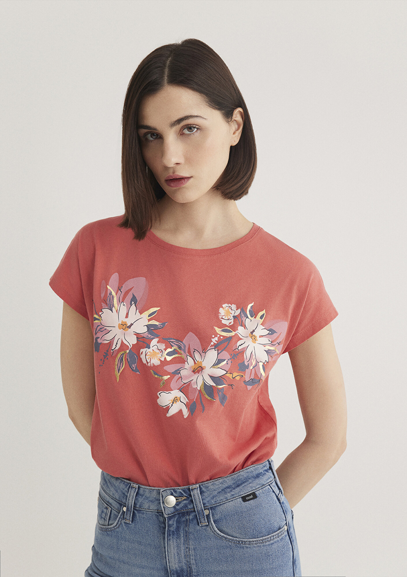 Çiçek Baskılı Turuncu Tişört, yüzde yüz pamuklu hafif ağırlıklı kumaştan üretilmiştir. Bisiklet yakalı ve kısa kollu tasarımı ile rahat bir kullanım sunar. Ön yüzünde zarif çiçek desenleri bulunan bu tişört, pembe, beyaz ve mavi tonlarında çiçek motifleriyle dikkat çeker. Bu grafik baskılı tişört, günlük kullanım için idealdir.