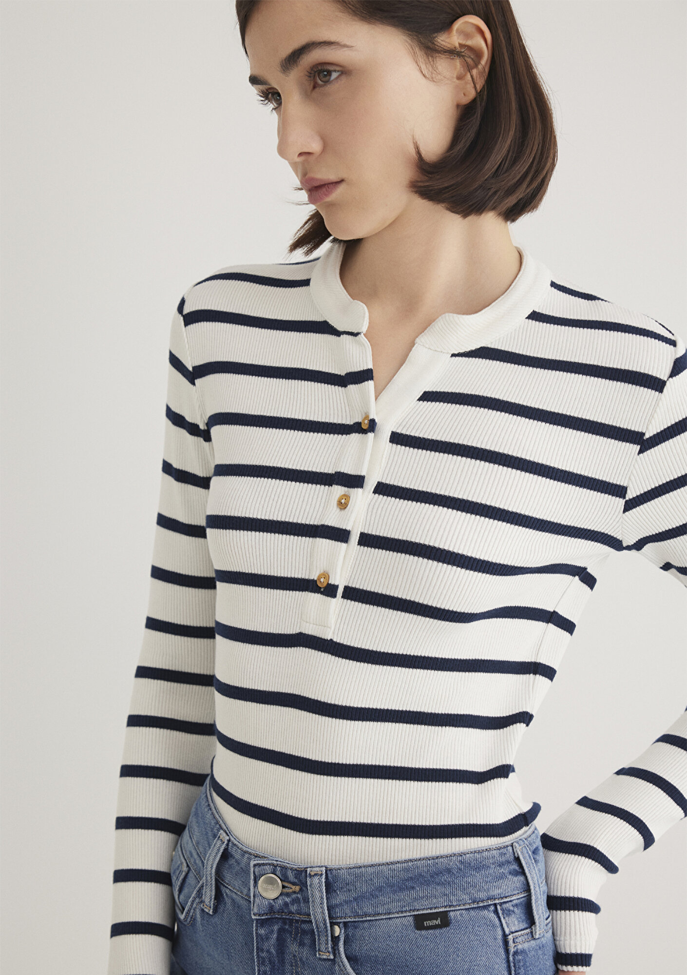 Düğme Detaylı Çizgili Tişört, esnek ve tok kumaştan üretilmiş şık bir tasarıma sahiptir. Fitted, vücuda oturan kesimi ve uzun kolları ile öne çıkan bu tişört, bisiklet yakası ve düğmeli detayı ile klasik bir görünüm sunar. Beyaz zemin üzerine lacivert yatay çizgili deseni ile denizci stilini yansıtan bu ürün, günlük kullanım için idealdir.