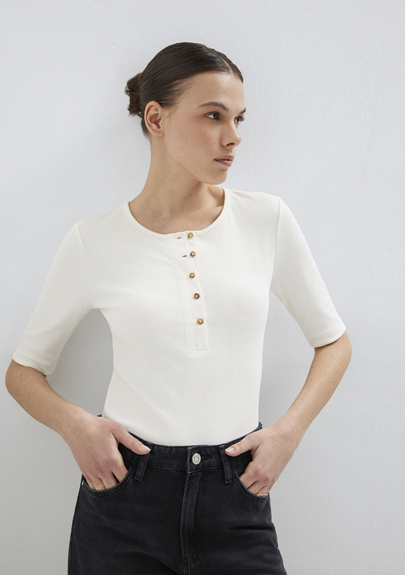 Mavi Düğme Detaylı Ekru Tişört Fitted / Vücuda Oturan Kesim 1613852-70051