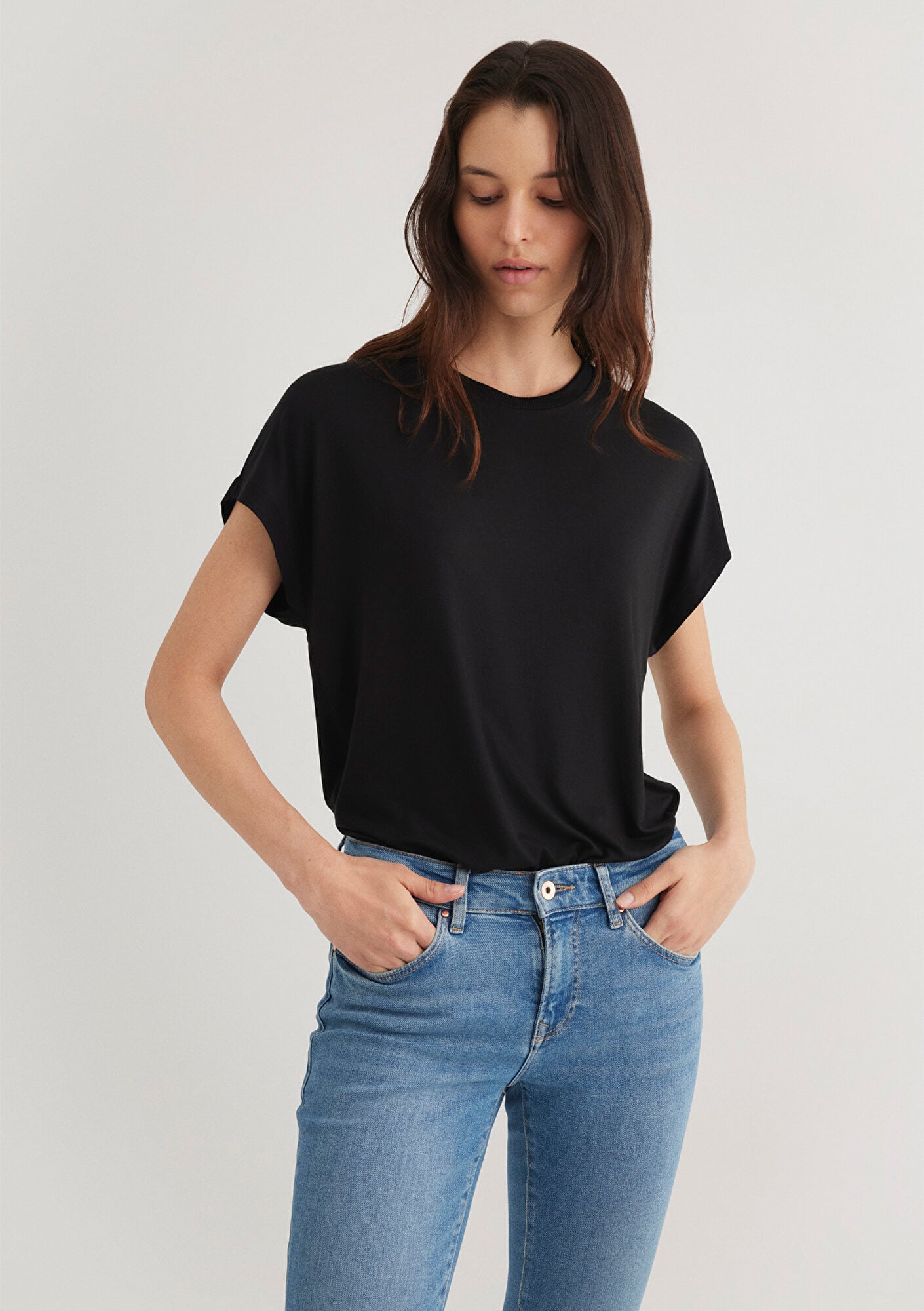 Viskoz karışımlı. Regular fit, normal kesim. Bisiklet yaka. Düşük omuz. Kısa kol. Düşük Omuz Siyah Basic Tişört.