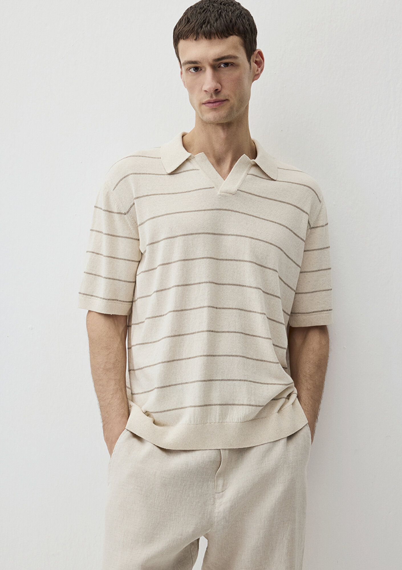 Sadeliğin özen ve kaliteyle buluştuğu Mavi Edition koleksiyonundan Ekru Çizgili Triko Polo.