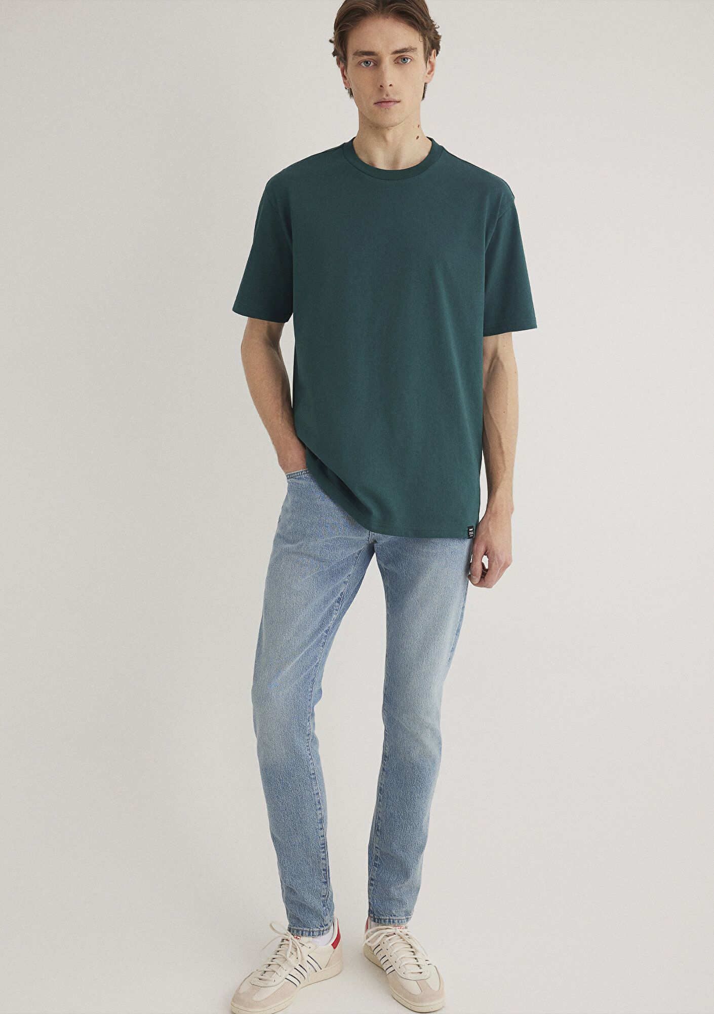 Yeşil Basic Tişört, yüzde yüz pamuklu orta ağırlıkta kumaştan üretilmiştir. Loose fit, rahat kesimi ve bisiklet yakası ile konforlu bir kullanım sunar. Kısa kollu tasarımı ve düz dokusuyla sade bir görünüm sağlayan bu tişört, günlük giyim için ideal bir seçenektir. Alt kısmında bulunan küçük etiket detayı, minimal bir dokunuş katmaktadır.