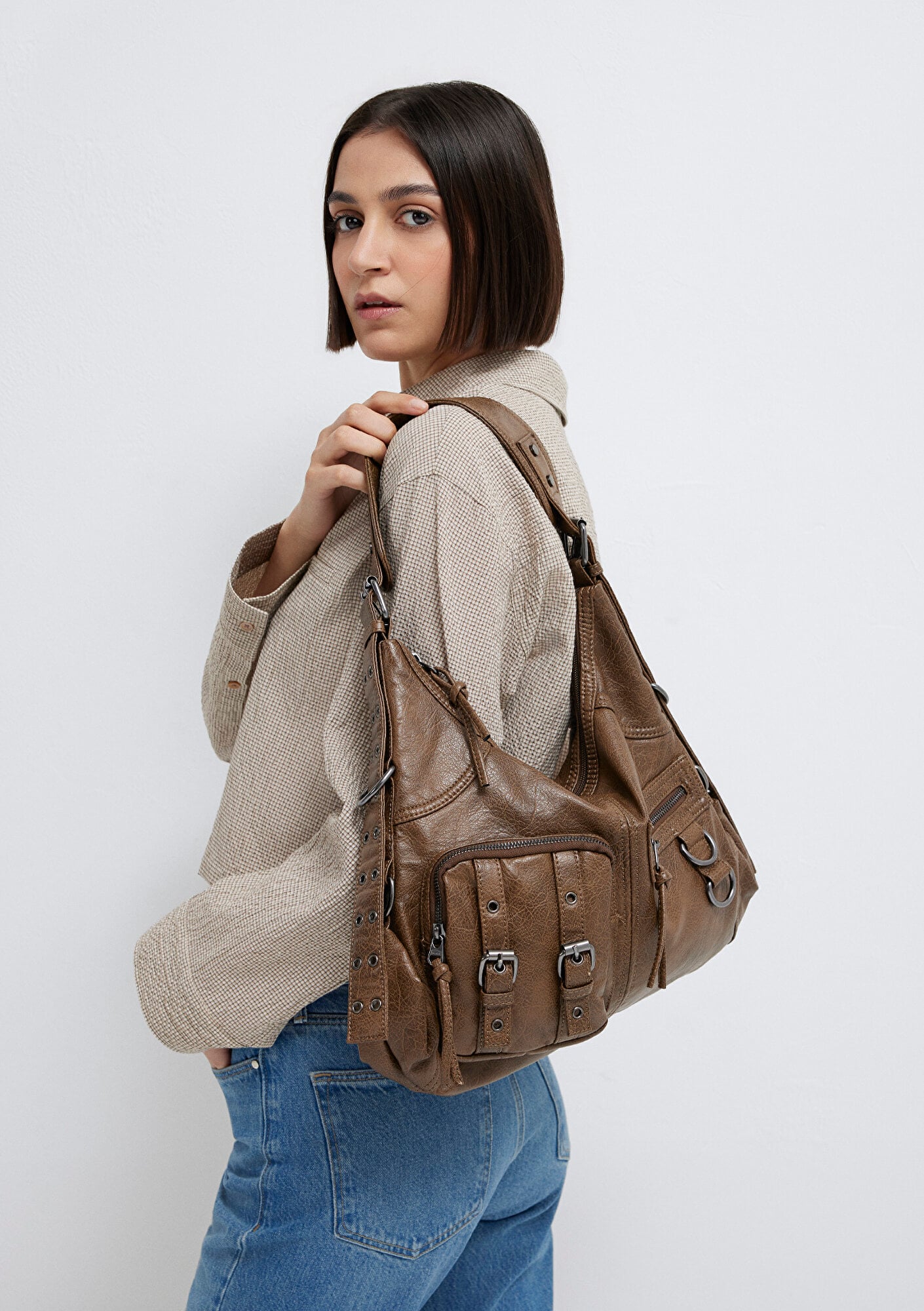 Mavi nin kadın koleksiyonundan Kahverengi Omuz Çantası. Fermuar kapamalı, fermuarlı ve fermuarsız iç cep, iki adet fermuarlı ön cep ve bir adet fermuarlı arka cep, sabit sap, astarlı.