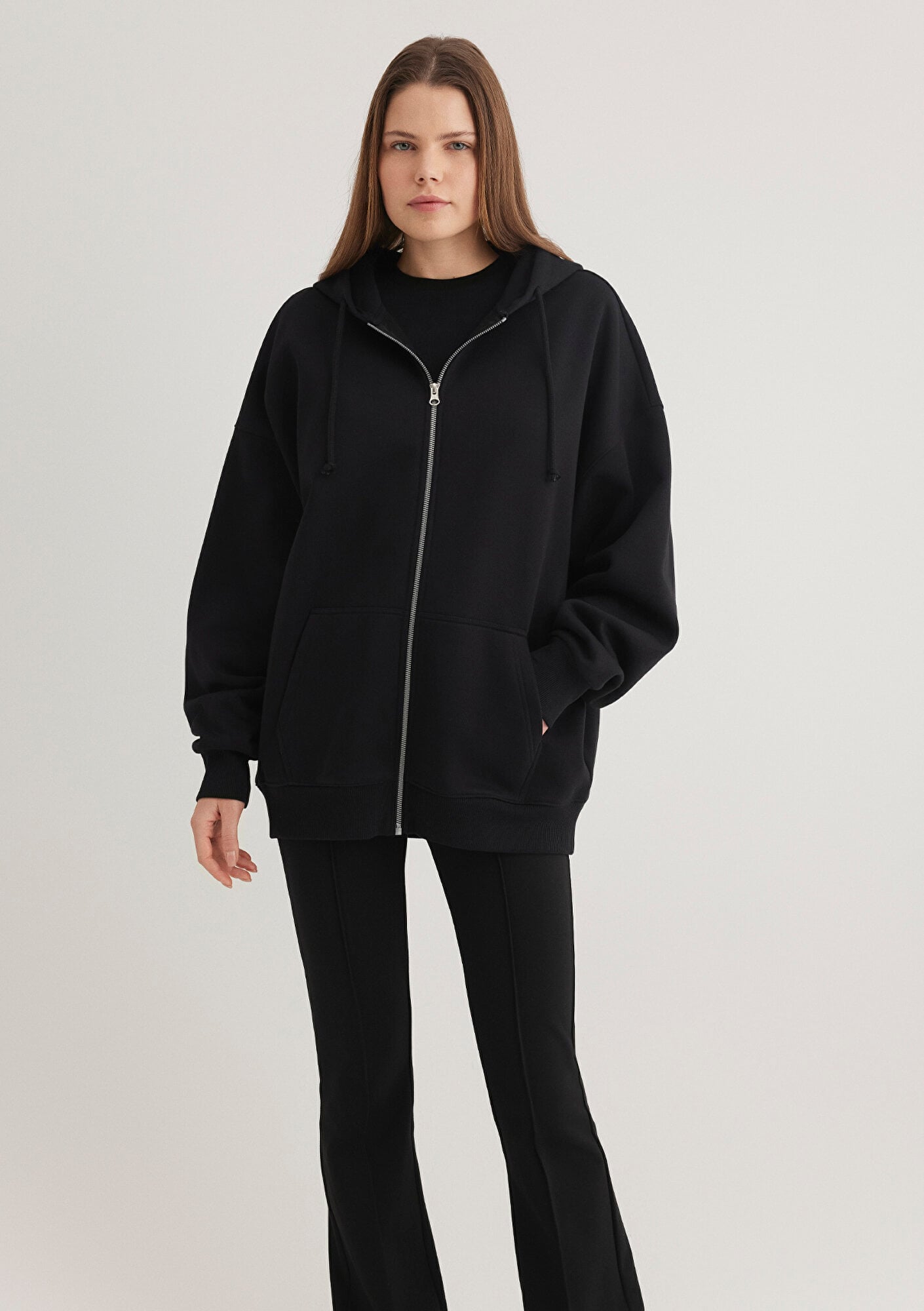 Mavi nin kadın koleksiyonundan Kapüşonlu Fermuarlı Siyah Sweatshirt. Şardonlu, fermuarlı, iple ayarlanabilir kapüşon, içi şardonlu kanguru cep.