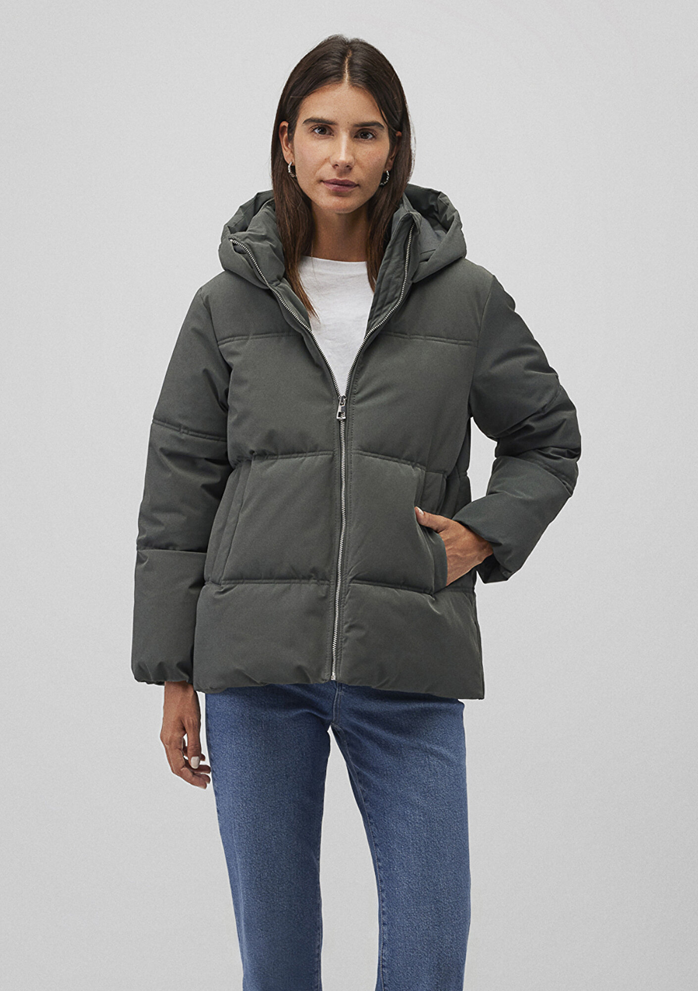 Mavi nin dış giyim koleksiyonundan Kapüşonlu Yeşil Şişme Mont. İki adet çıt çıtlı yan cep, sabit kapüşon, içten stoperli iple ayarlanabilir etek.