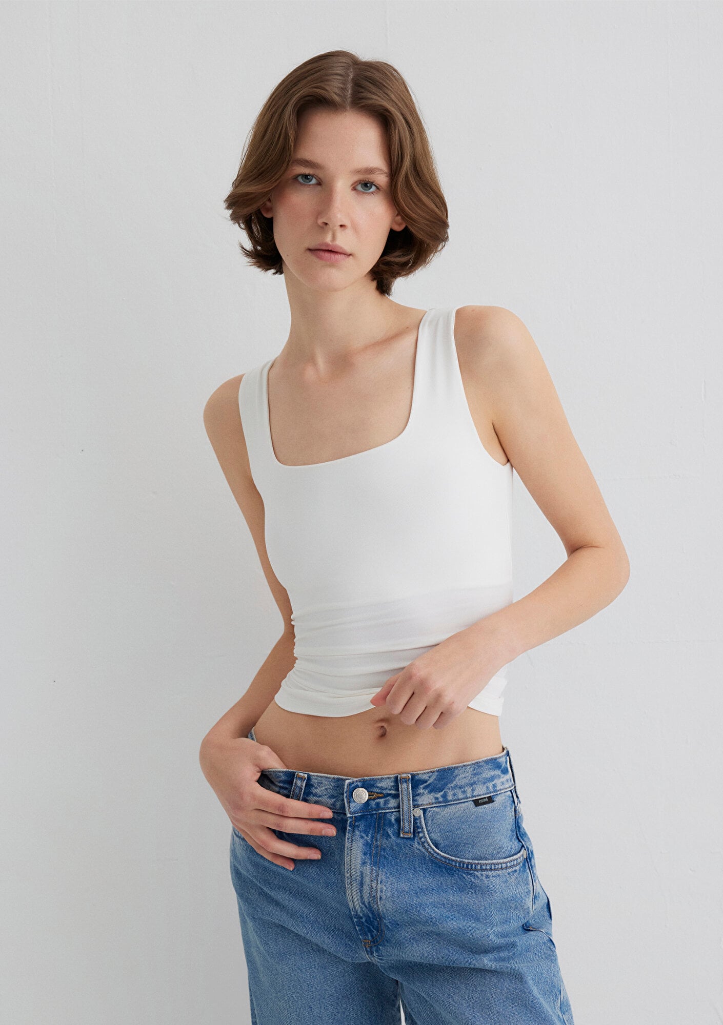 Mavi nin kadın koleksiyonundan Kare Yaka Beyaz Poliamid Atlet Vücudu saran, kare yaka, kalın askılı, ön kısmı göğüs altına kadar astarlı, poliamid basic atlet.