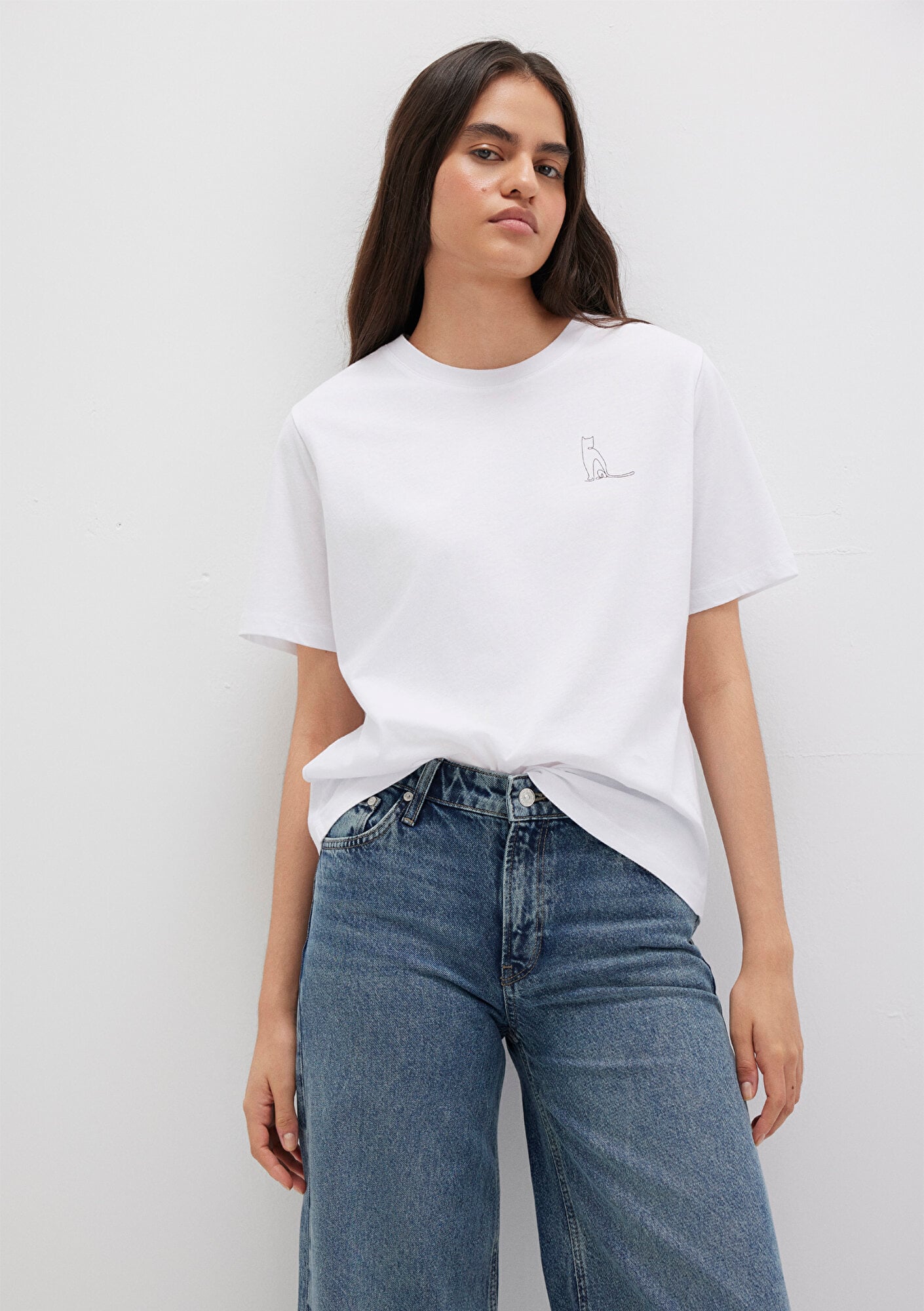 Kedi Baskılı Beyaz Tişört, yüzde yüz pamuklu hafif ağırlıklı kumaştan üretilmiştir. Bisiklet yakalı ve kısa kollu tasarımı ile rahat bir kullanım sunar. Ön kısmında minimalist tarzda çizilmiş siyah kedi figürü baskısı ile şık ve sevimli bir görünüm sağlar.