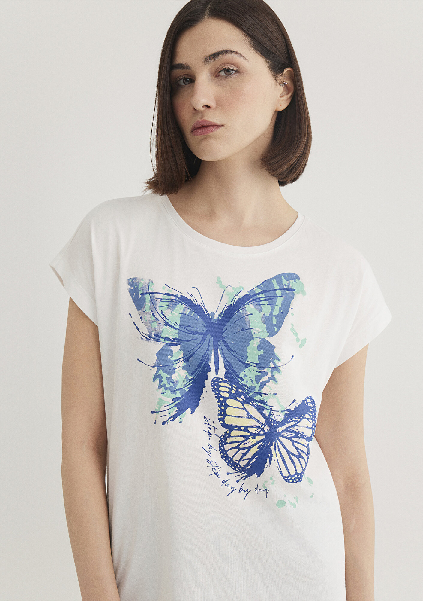 Kelebek Baskılı Beyaz Tişört, yüzde yüz pamuklu hafif ağırlıklı kumaştan üretilmiştir. Bisiklet yaka ve kısa kollu tasarımıyla rahat bir kullanım sunar. Ön yüzünde mavi ve yeşil tonlarında büyük kelebek deseni ile küçük sarı mavi kelebek baskısı bulunmaktadır. Tişörtün üzerinde step by step day by day yazısı yer almaktadır.