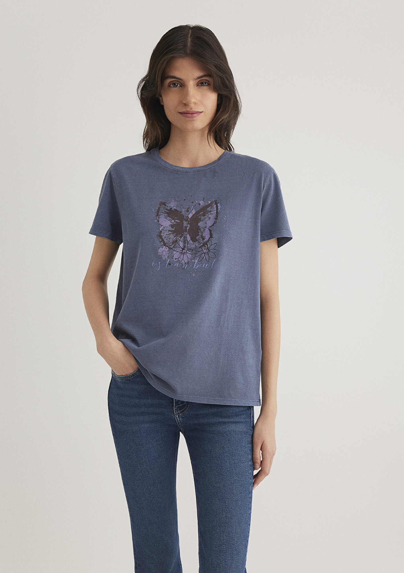 Kelebek Baskılı Lacivert İstanbul Tişört, yüzde yüz pamuklu orta ağırlıkta kumaştan üretilmiştir. Bisiklet yaka ve kısa kollu tasarımı ile rahat bir kullanım sunar. Ön yüzünde mor tonlarında kelebek ve çiçek desenleri ile istanbul yazısı bulunan grafik baskısı dikkat çeker. Bu tişört, Mavi nin İstanbul Tişörtleri Serisi orijinal ürünüdür. İstanbul un yaratıcılık ve tasarıma verdiği ilhamı gösterir, İstanbul da doğmuş bir moda fenomeninin parçasıdır, İstanbul u sevenlerin yarattığı modanın bir simgesidir. Bu tişörtü giyen dünyanın neresinde olursa olsun, İstanbul dan bir parçayı içinde taşıyor demektir.