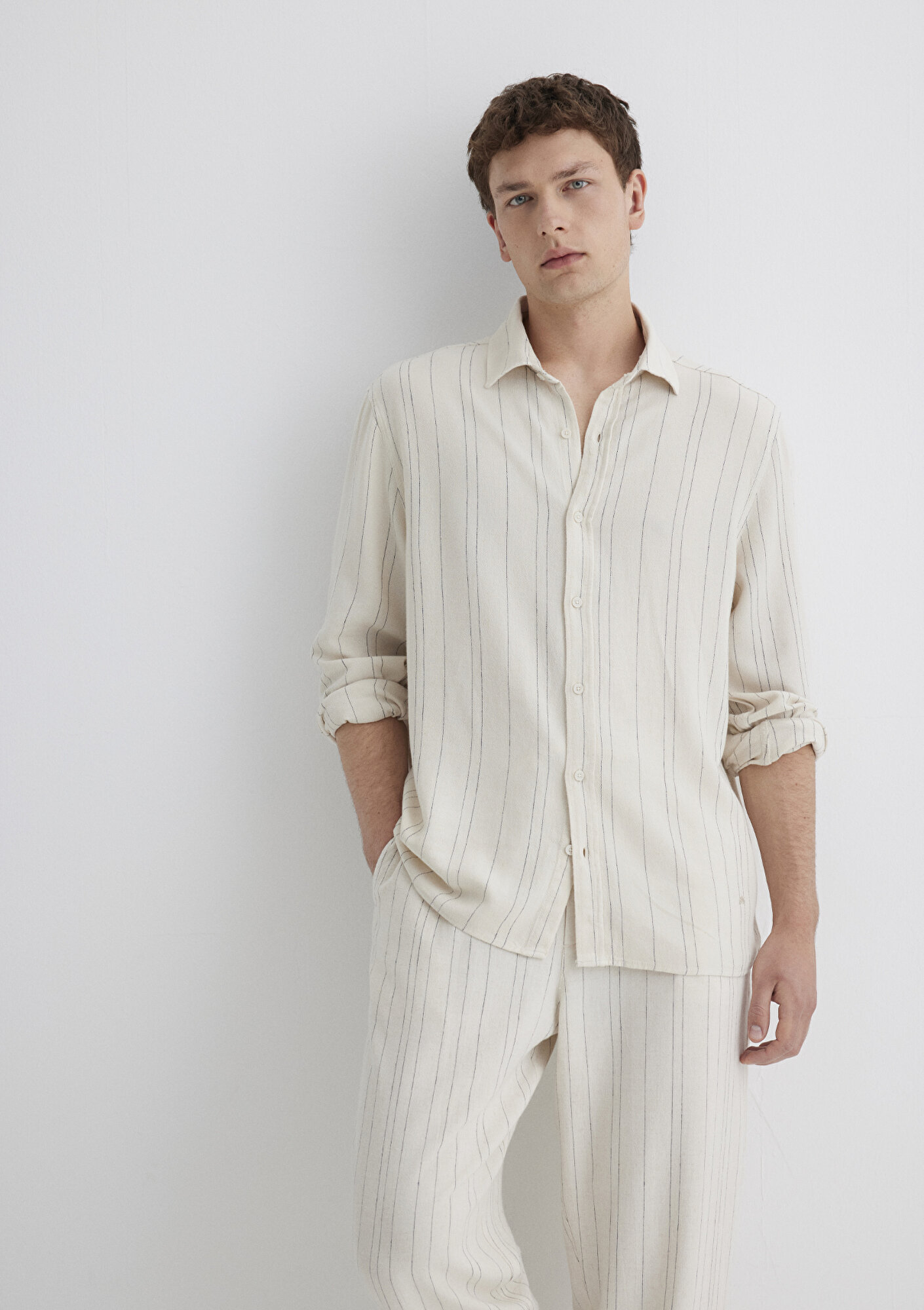 Mavi Keten Karışımlı Çizgili Bej Gömlek Regular Fit / Normal Kesim 0211617-83884
