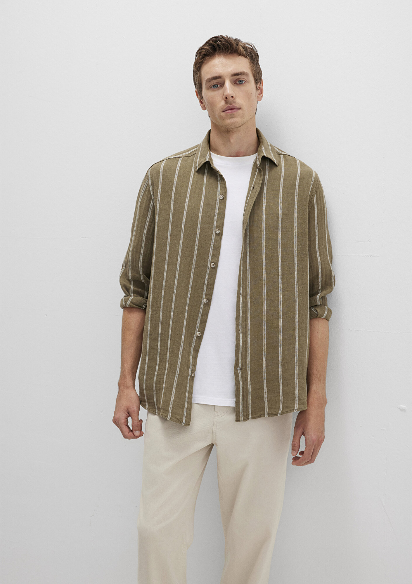 Mavi nin erkek koleksiyonundan Keten Karışımlı Çizgili Haki Gömlek.