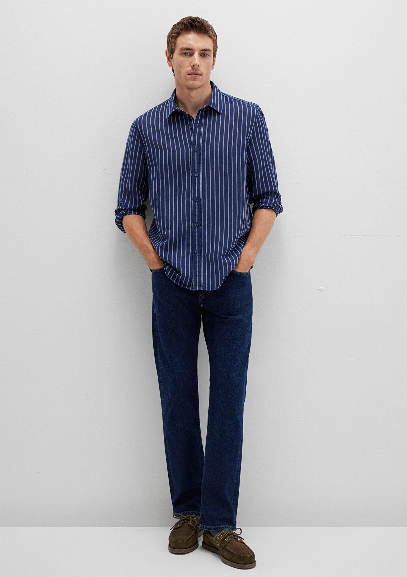 Mavi Keten Karışımlı Çizgili Lacivert Gömlek Regular Fit / Normal Kesim 0211699-90920