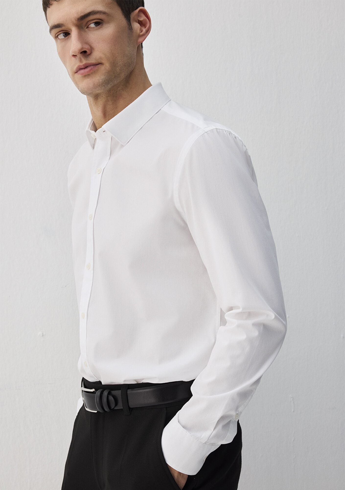 Yüzde yüz pamuk poplin kumaşıyla nefes alabilen ve konforlu bir deneyim sunan bu gömlek, slim fit kesimiyle vücuda tam oturur ve gün boyu rahatlık sağlar. Easy Care teknolojisi sayesinde, yıkama sonrası kırışıklık oluşumunu minimuma indirir maksimum 5 yıkamaya kadar geçerlidir, ütülemeyi ise çok daha pratik hale getirir. Yoğun iş temposunda zaman kazandırırken, aynı zamanda kusursuz bir görünüm sunar. Düğme patındaki ton üzeri ton mühür nakış detayı ve ayarlanabilir manşetler, bu gömleği hem iş hem de özel günlerde şıklığından ödün vermeden kullanabileceğin bir parça yapar. Omuz ve robadaki dikişsiz görünüm, modern ve rafine bir tarz sunar. Kalın tela desteği yakayı gün boyu formda tutarken, gizli düğme detayı yakayı sabitleyerek kusursuz bir görünüm sağlar. İster iş görüşmesinde ister ofiste, ister şık bir akşam yemeği ya da davette rahatlıkla giyebileceğin bu gömlek, her anında şıklığı ve konforu bir arada sunar.