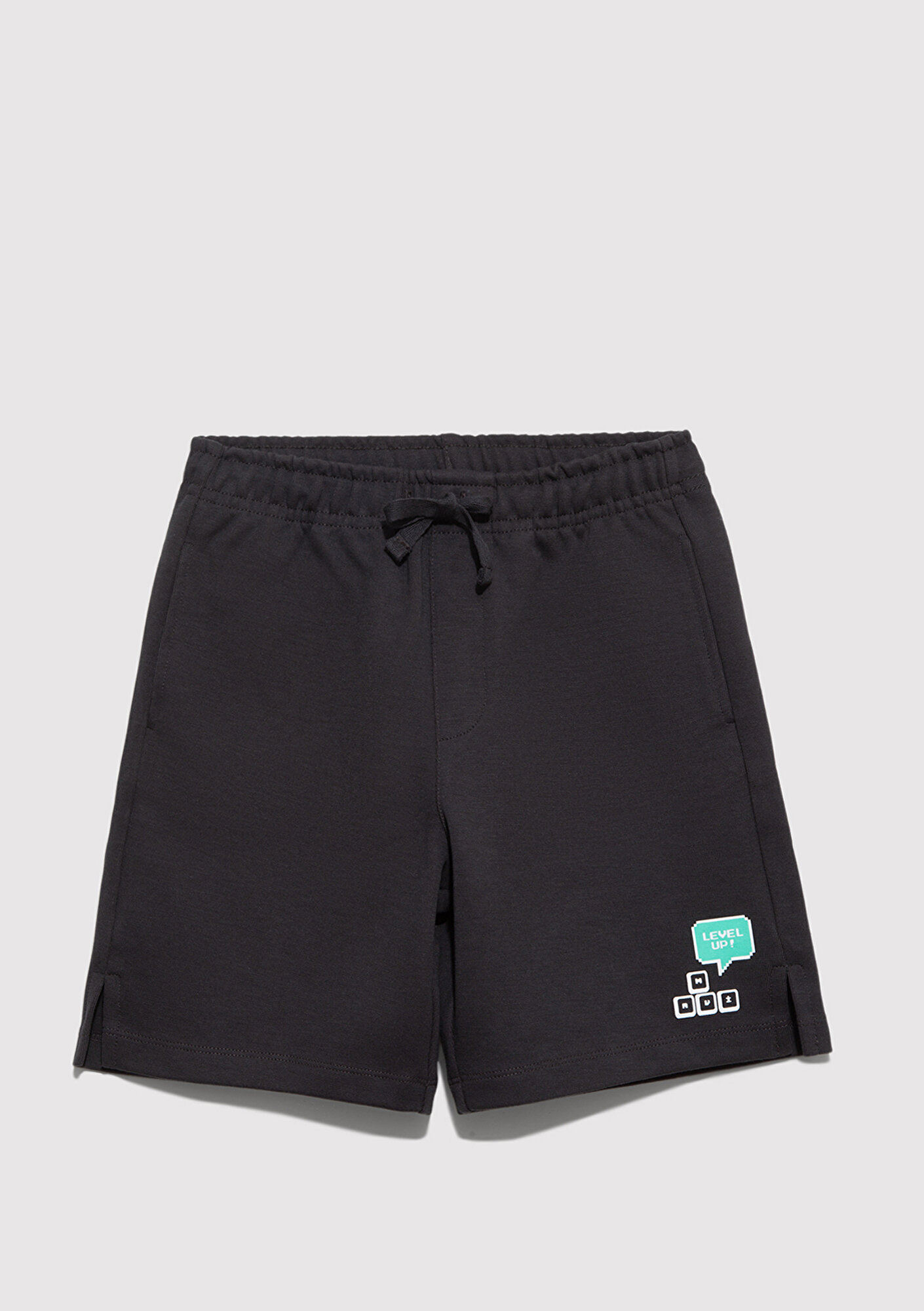 Mavi nin erkek çocuk koleksiyonundan Level Up Baskılı Antrasit Şort. Şardonsuz, iki adet yan cep, iple ayarlanabilir bel.
