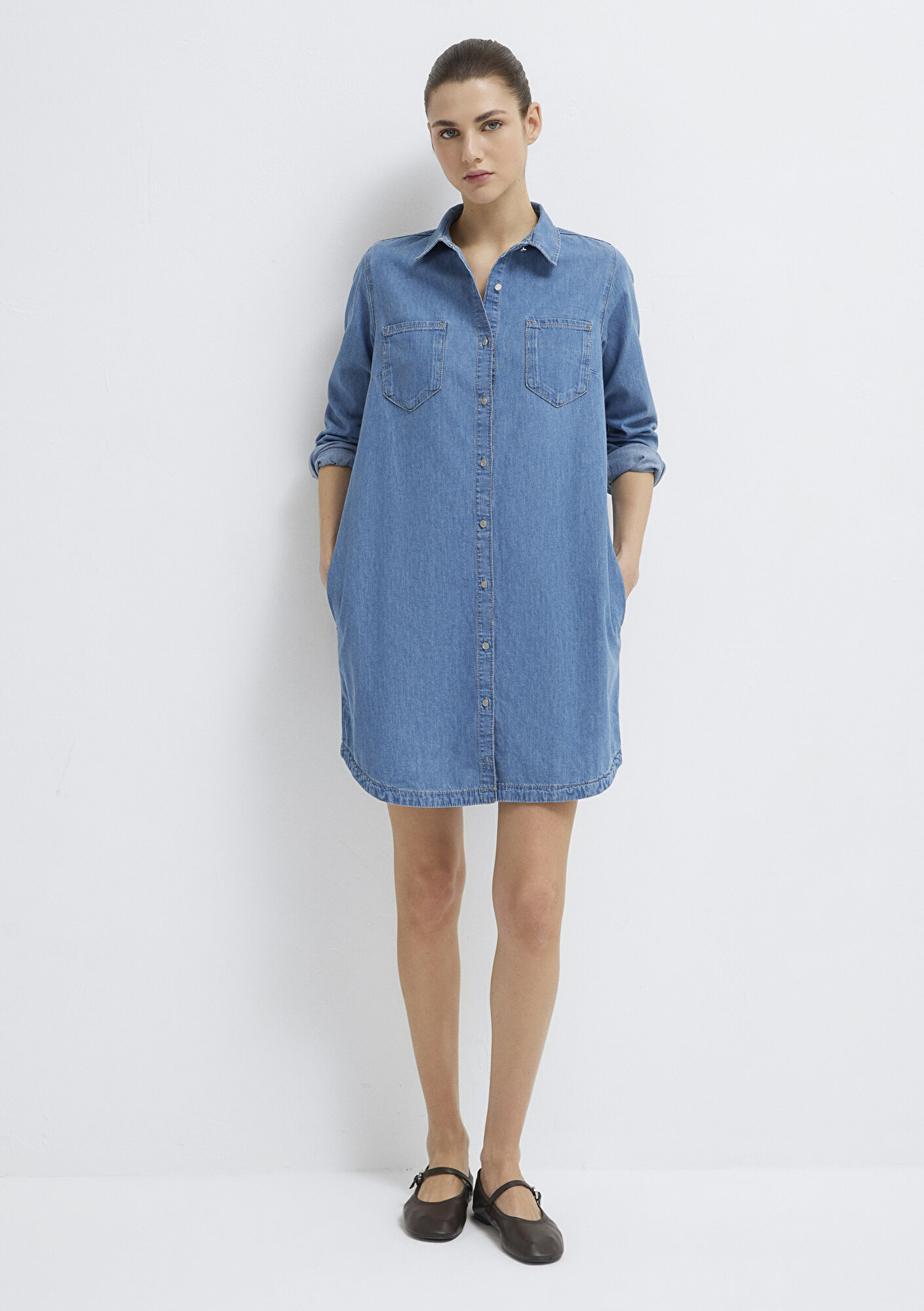 Mavi nin denim koleksiyonundan Liz Mavi Jean Elbise. Midi, önden düğmeli jean gömlek elbise.