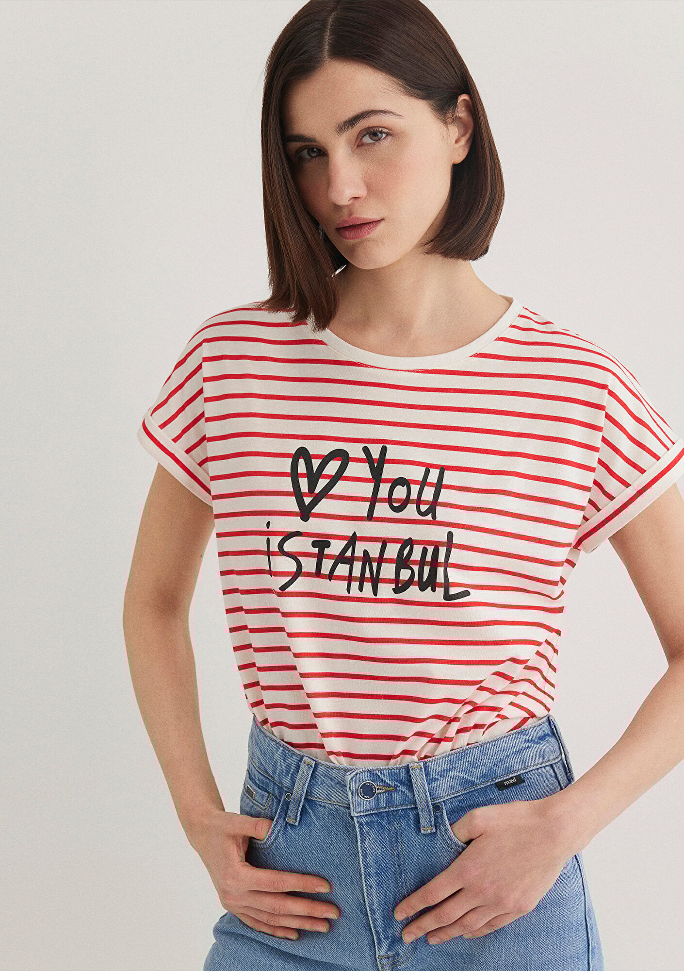 Mavi Love You Baskılı Çizgili Istanbul Tişört Regular Fit / Normal Kesim 167986-26829