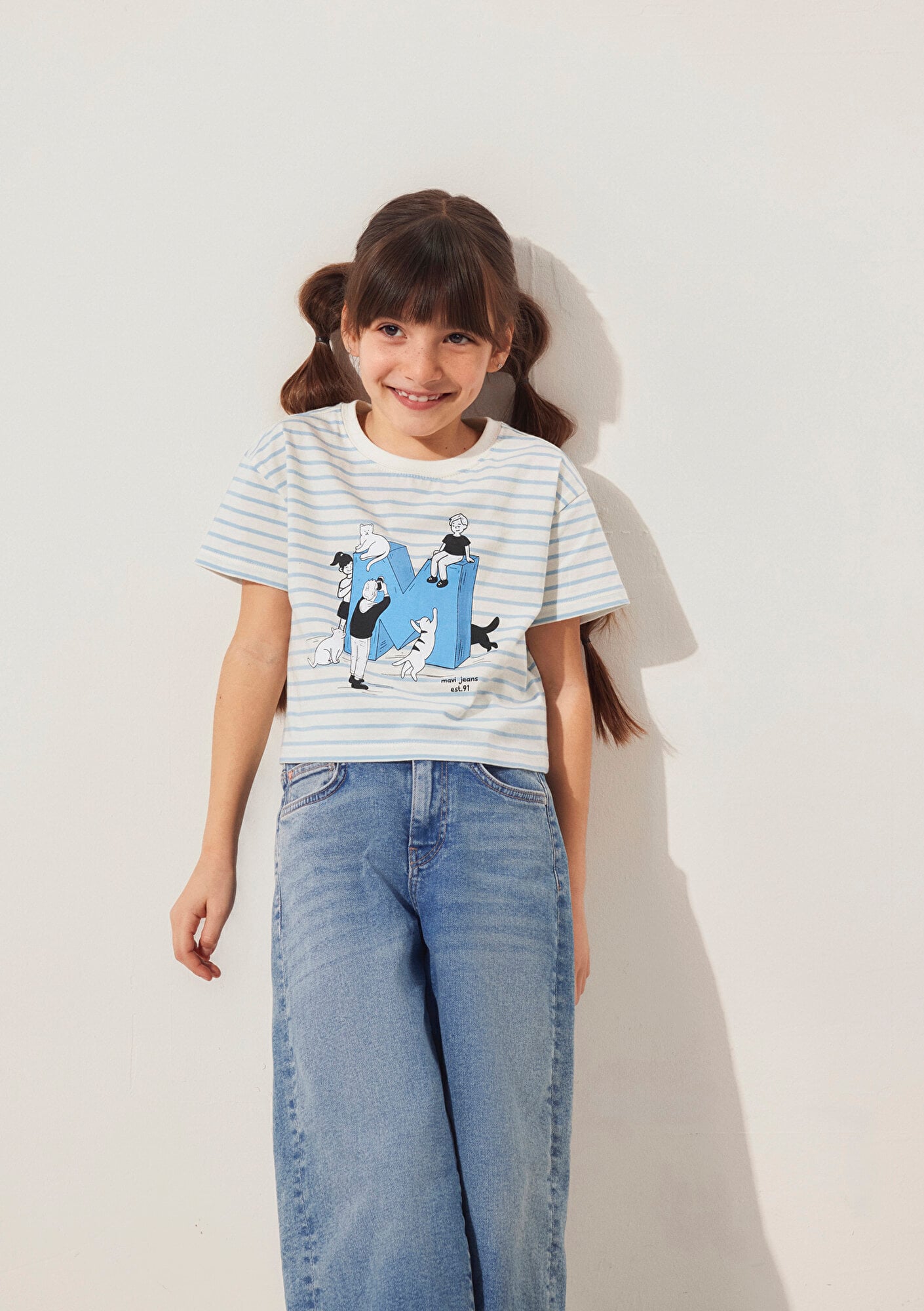 M Logo Baskılı Mavi Çizgili Tişört, yüzde yüz pamuklu orta ağırlıkta kumaştan üretilmiştir. Çocuk bölümünde yer alan bu tişört, loose fit, rahat kesimi ve bisiklet yakası ile konfor sunar. Kısa kollu ve kısa kesimli tasarımı, mavi beyaz çizgili deseni ve ön yüzündeki eğlenceli grafik baskısı ile dikkat çeker. Günlük kullanım için idealdir.