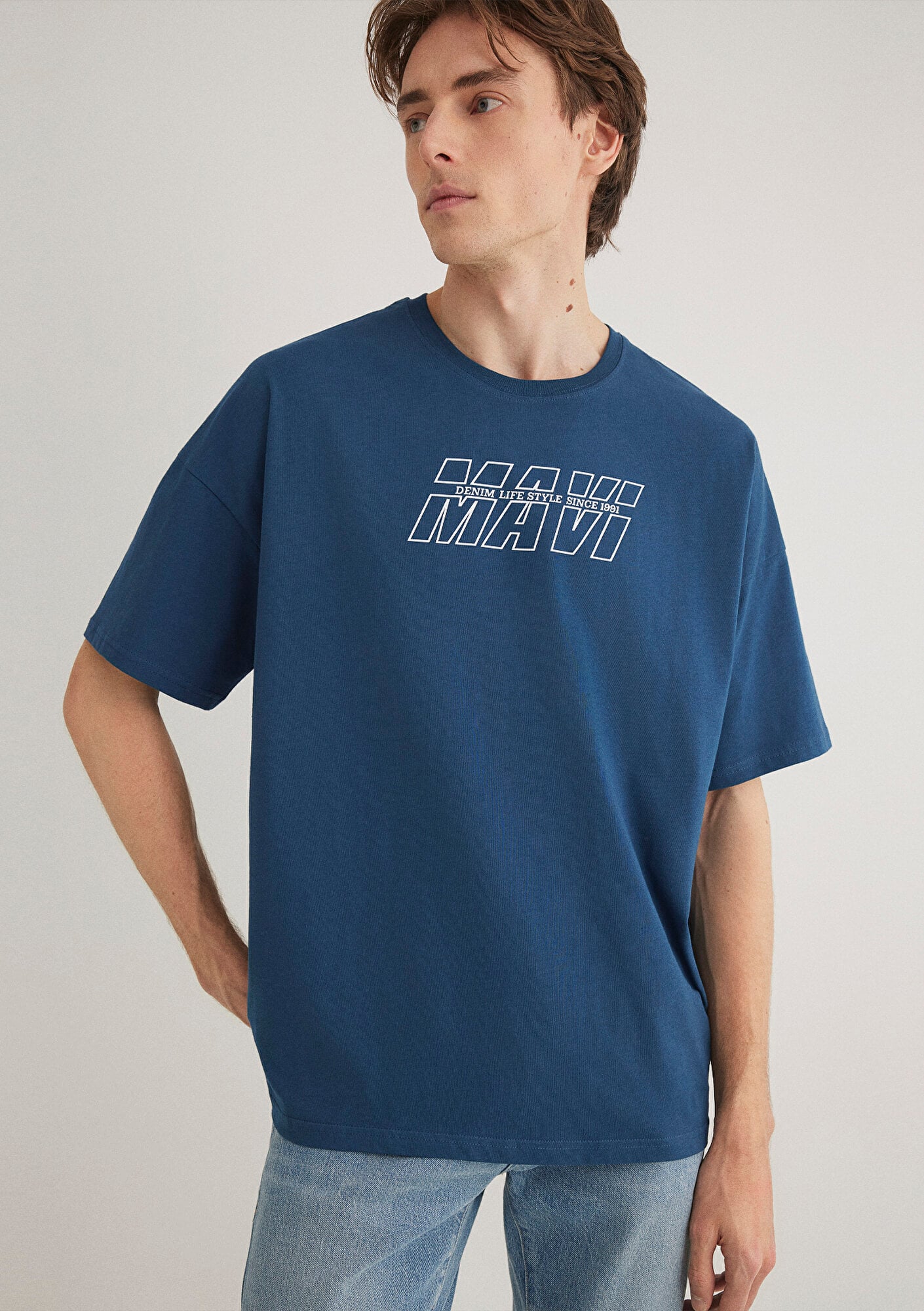 Mavi Baskılı Lacivert Tişört, yüzde yüz pamuklu hafif ağırlıklı kumaştan üretilmiştir. Oversize, geniş kesim ve bisiklet yaka tasarımıyla rahat bir kullanım sunar. Kısa kollu olan bu tişört, ön yüzündeki beyaz renkli logo baskısı ile sade bir görünüm sağlar. Lacivert rengi ve rahat yapısıyla günlük giyim için ideal bir seçenektir.