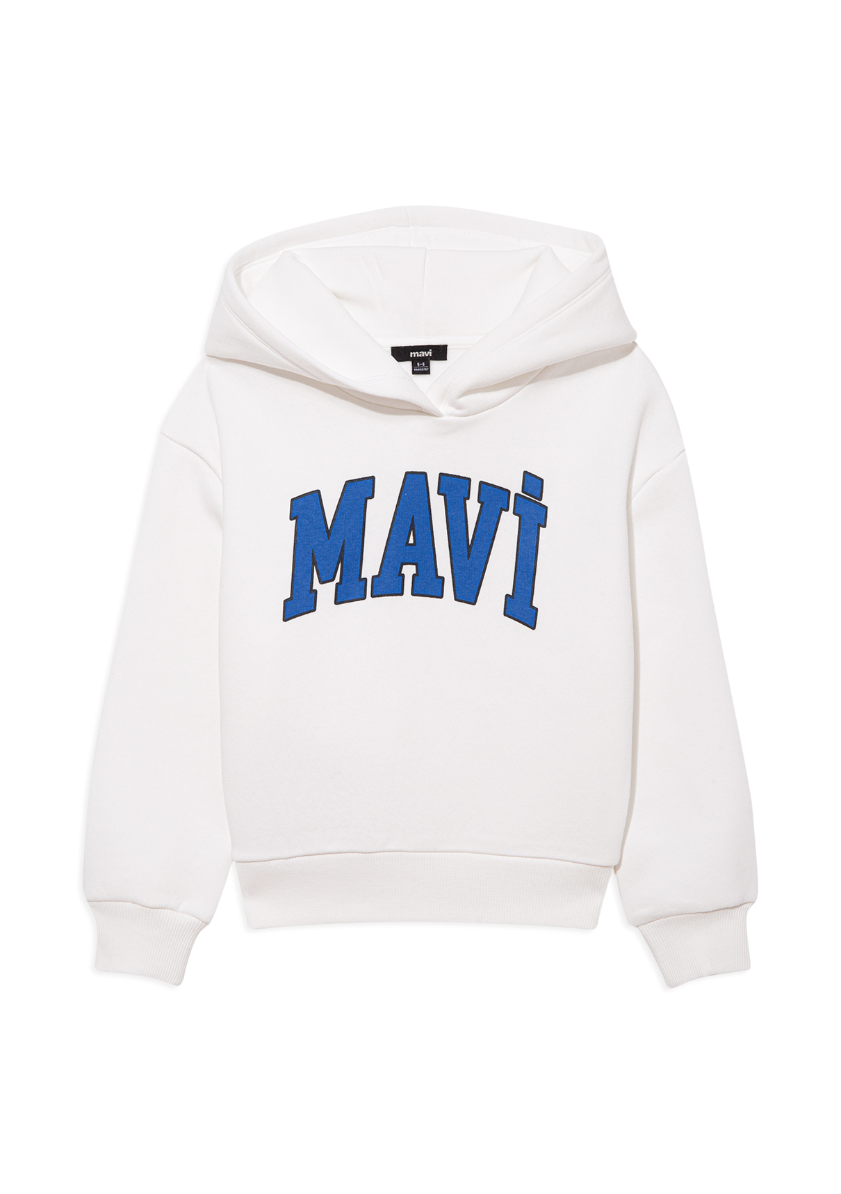 Mavi nin erkek çocuk koleksiyonundan Mavi Logo Baskılı Beyaz Kapüşonlu Sweatshirt. Şardonlu, kapüşonlu.