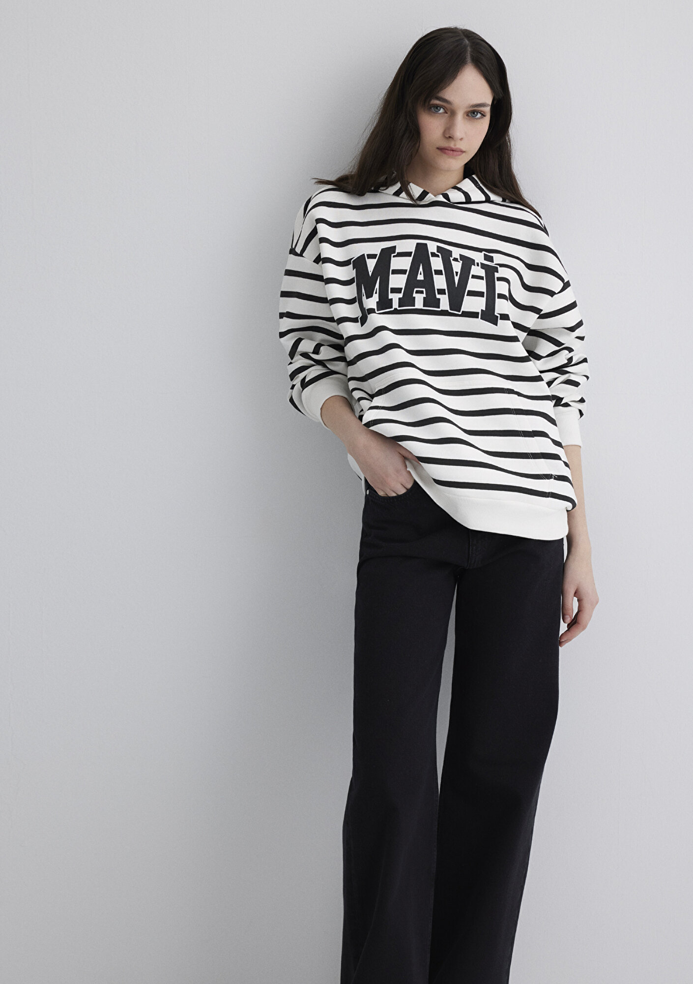 Mavi nin kadın koleksiyonundan Mavi Logo Baskılı Beyaz Sweatshirt. Şardonlu, kapüşonlu, içi şardonlu kanguru cep.