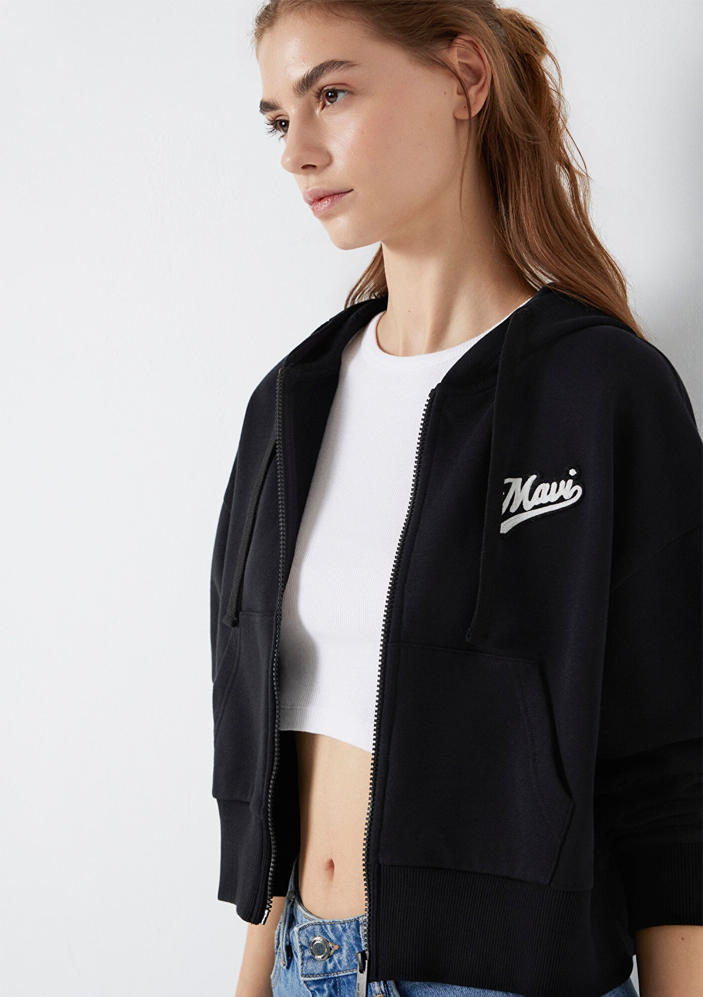 Mavi nin kadın koleksiyonundan Mavi Logo Baskılı Kapüşonlu Siyah Sweatshirt. Şardonsuz, iple ayarlanabilir kapüşon, fermuarlı, kanguru cepli.