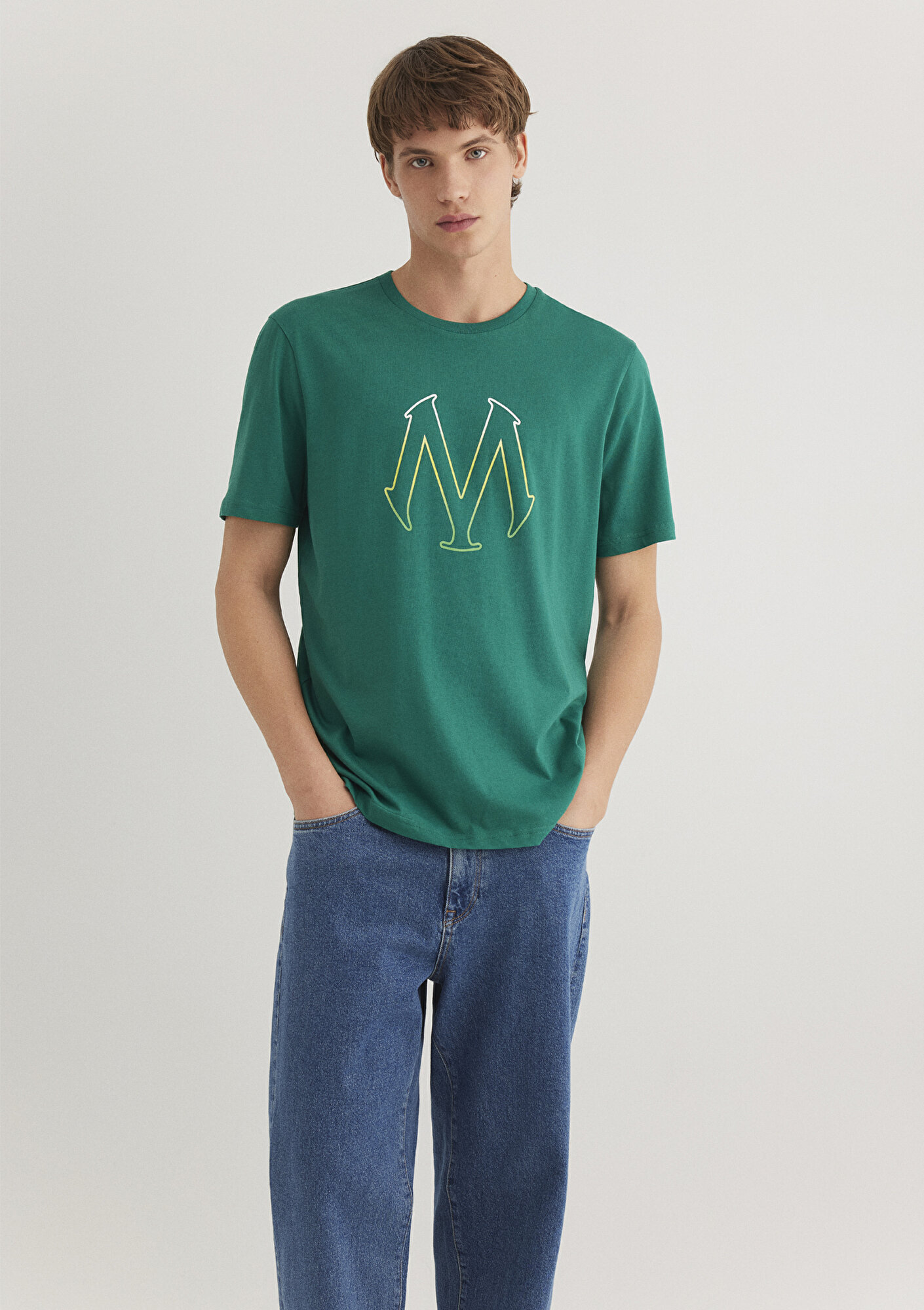 Mavi Logo Baskılı Yeşil Tişört, yüzde yüz pamuklu orta ağırlıkta kumaştan üretilmiştir. Bisiklet yakalı ve kısa kollu olan bu tişört, ön yüzündeki gradyan renkli M harfi baskısı ile dikkat çeker. Rahat kesimi ve yumuşak dokusuyla günlük kullanım için idealdir.